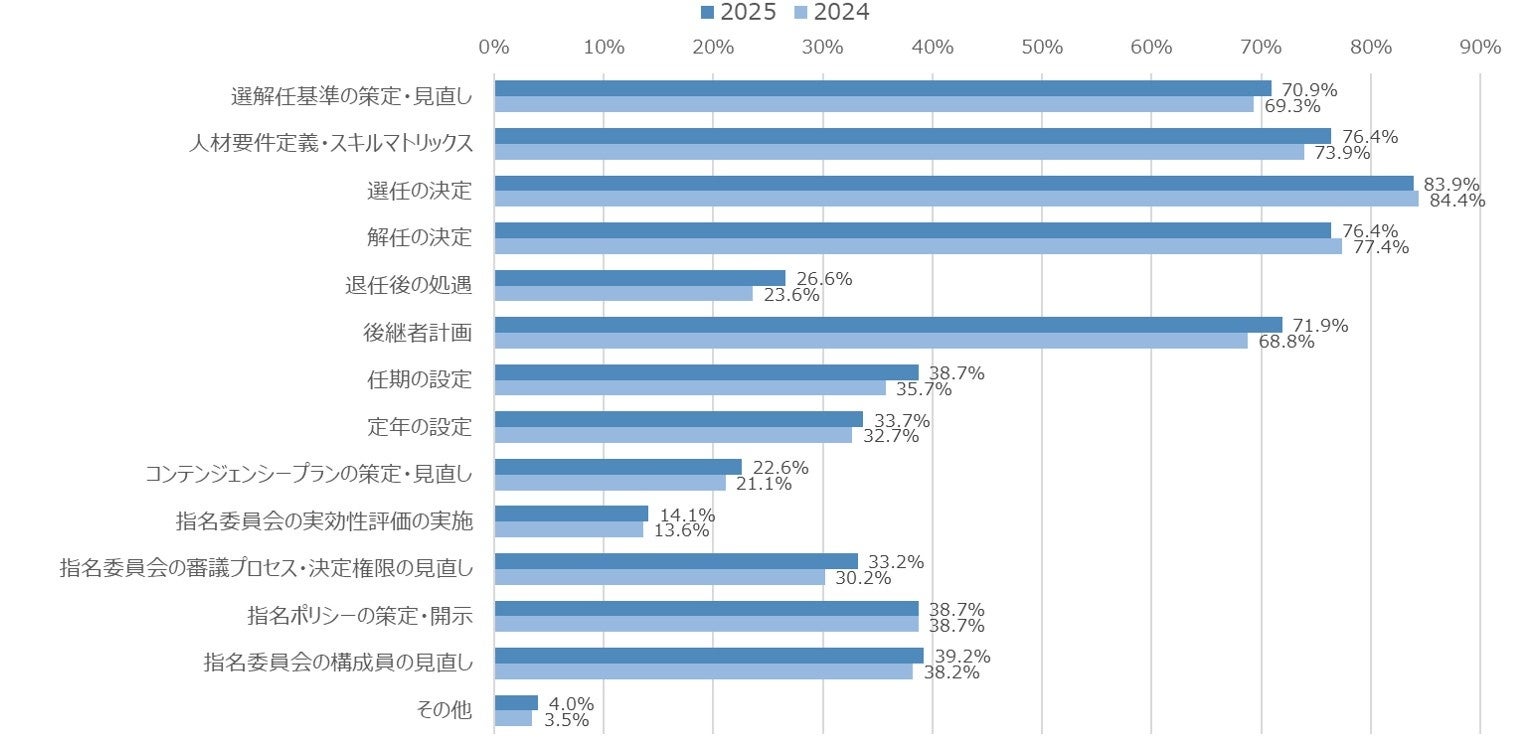 直近3年連続して本サーベイに参加している174社(指名委員会設置済)について、指名委員会の開催回数の平均値は2025年では5.9回であり、2023年の4.9回、2024年の5.6回から増加しました。また、2年連続サーベイ参加企業199社を対象に、指名委員会の審議事項についてみたところ、「選任の決定」(83.9%)を挙げる企業の割合が最も多く、続いて、「解任の決定」(76.4%)、「人材要件定義・スキルマトリックス」(76.4%)でした(図表5)。昨年比に着目すると、「後継者計画」(71.9%)が昨年比3.1%pt増と最も増加したほか、「退任後の処遇」(26.6%)、「任期の設定」(38.7%)、「指名委員会の審議プロセス・決定権限の見直し」(33.2%)は審議している企業は4割未満であるものの、昨年比3.0%pt増加しました。