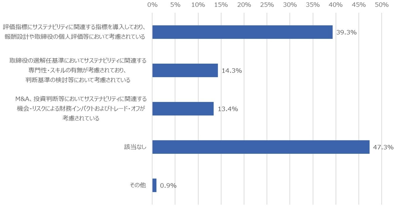 サステナビリティ領域のサーベイに参加した111社を対象に、取締役会による経営の監督においてサステナビリティがどのように考慮されているかを調査した結果、4割弱の企業では報酬設計や取締役の個人評価等でサステナビリティが考慮されていました(図表12)。一方で、取締役の選任基準の検討や投資判断といった戦略的な意思決定においては、サステナビリティが考慮されている企業は約1割にとどまり、十分に進んでいないことが明らかになりました。