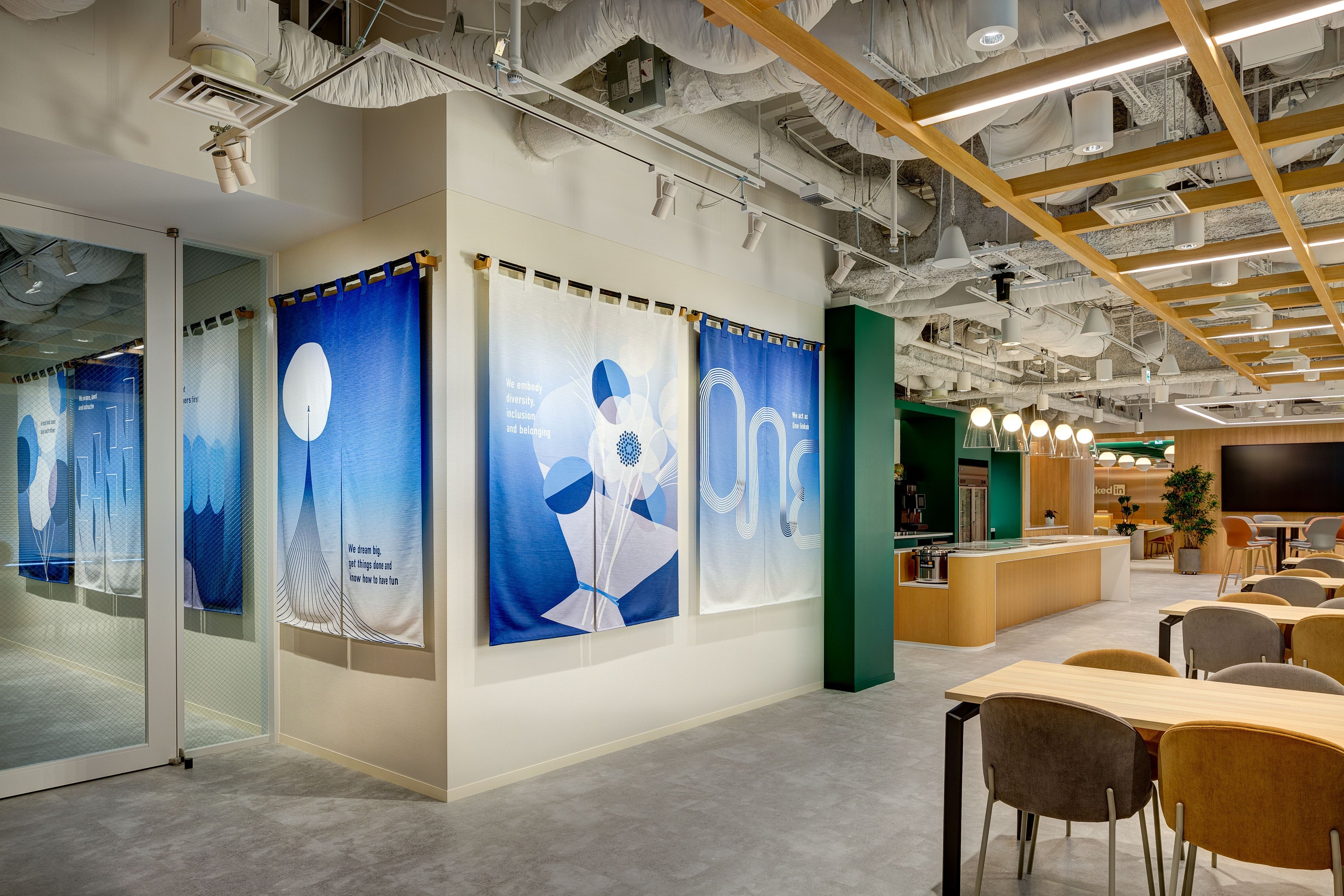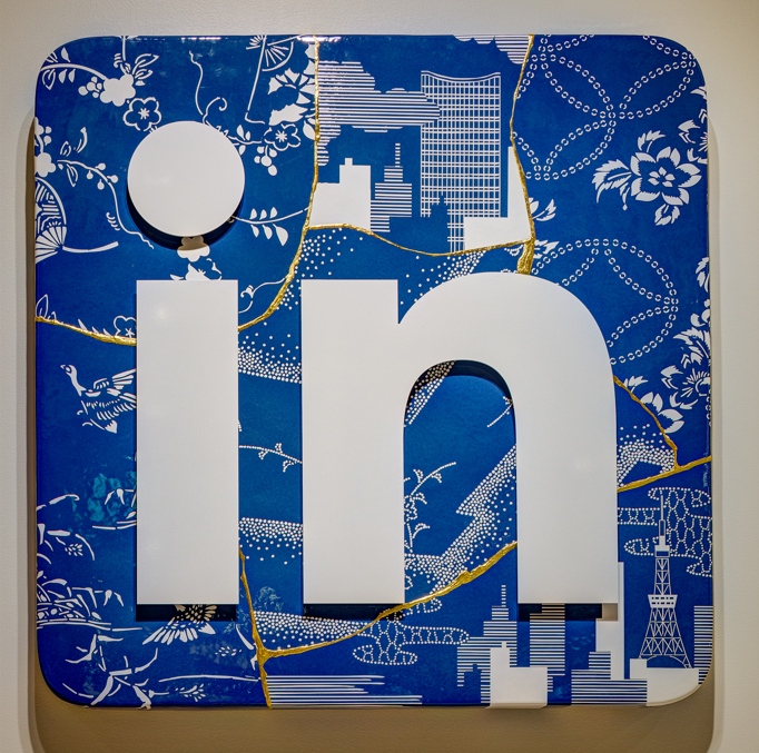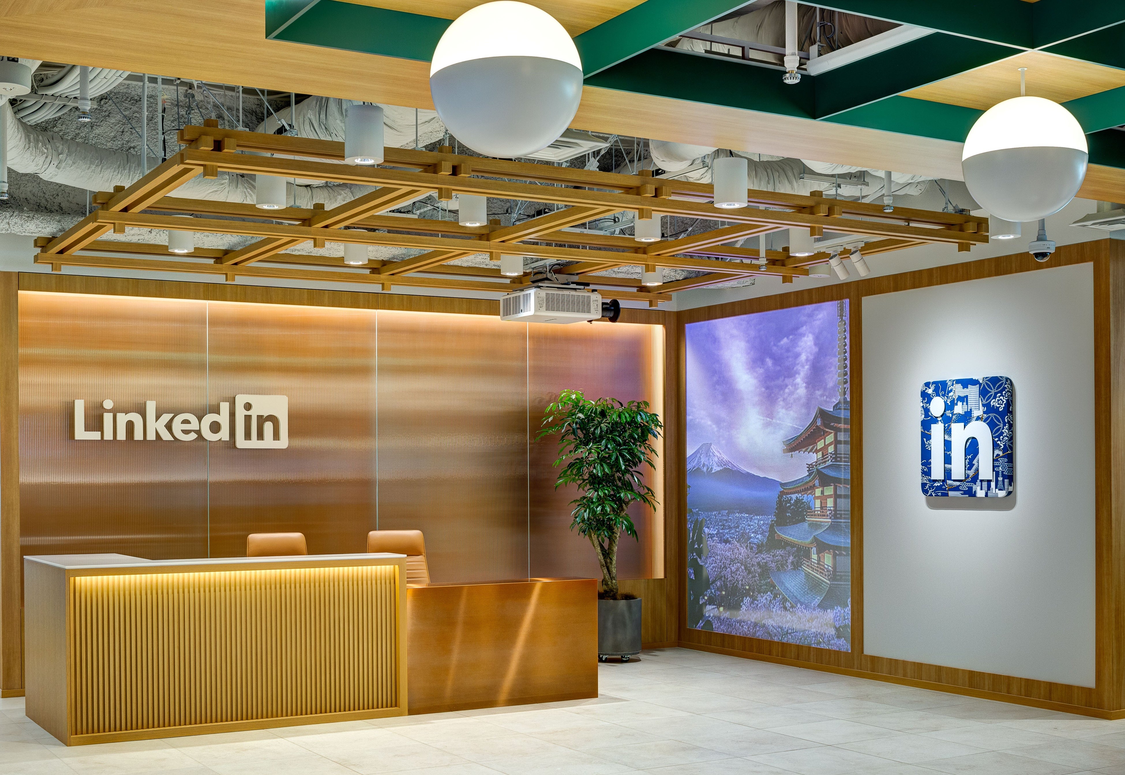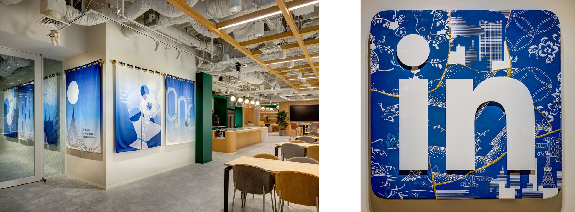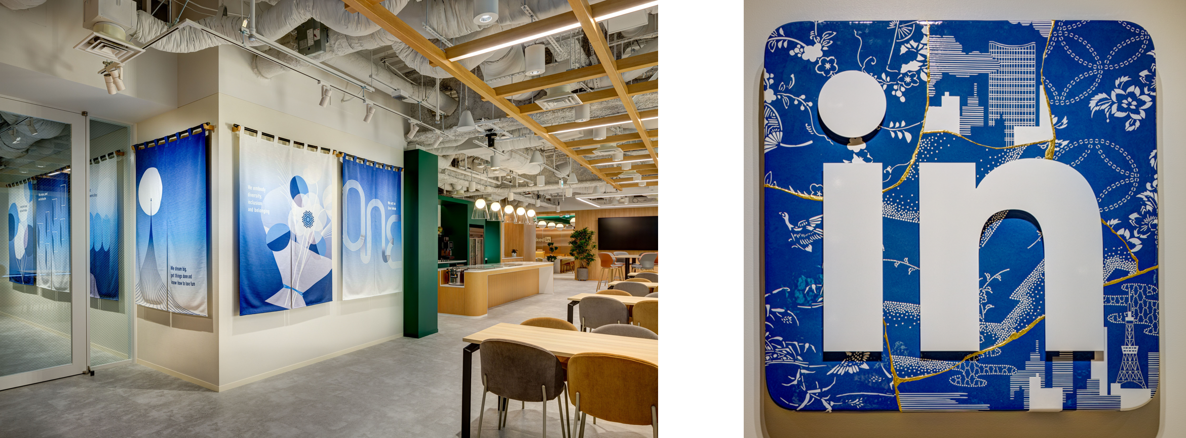 新オフィスのデザインは、日本の伝統的な釘を使わずに木材を組み合わせる技法である「木組み」構造に着想を得て設計し、日本の建築文化における美しさと機能性を象徴しています。また、世界中のLinkedInオフィスのロゴはその地域の意味が込められたものをモチーフに制作しています。日本の新オフィスでは、伝統的な修復技術の「金継ぎ」をモチーフに制作しました。