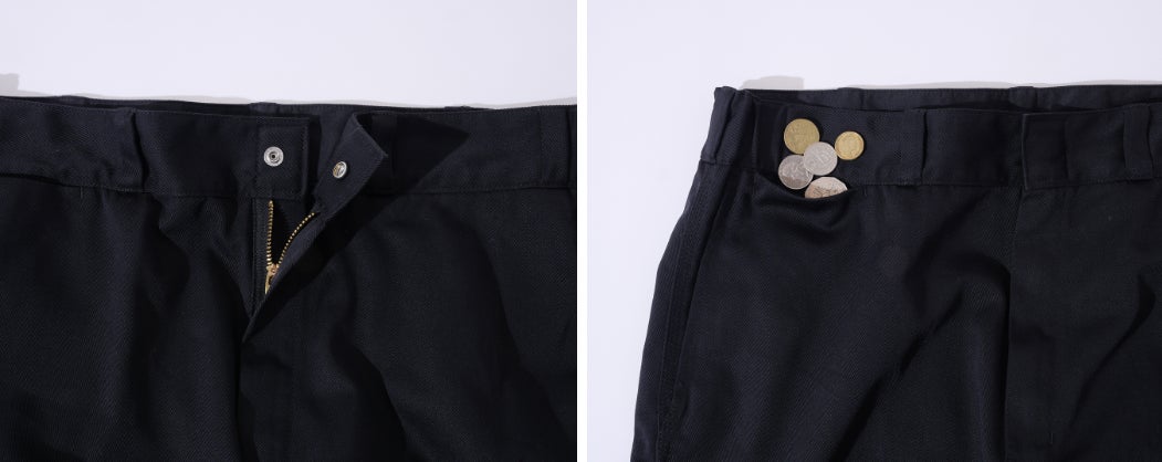 また、右フロントにはクラシックなワークスタイルを彷彿とさせるコインポケットを追加。細部までこだわった仕上がりです。