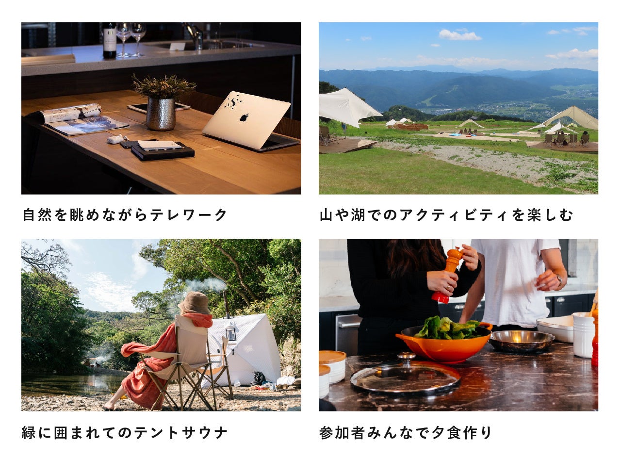 一流ホテルや会員制施設、高級ヴィラなどを含めたリゾートワークスの提携施設にて、ウェルネスワーケーション体験をしていただきます。今回は、グリーンシーズンの白馬の美しい自然の中で行うテントサウナと様々なアクティビティをご体験いただくウェルネスワーケーション企画に各回10名様、合計20名様を無料ご招待いたします。