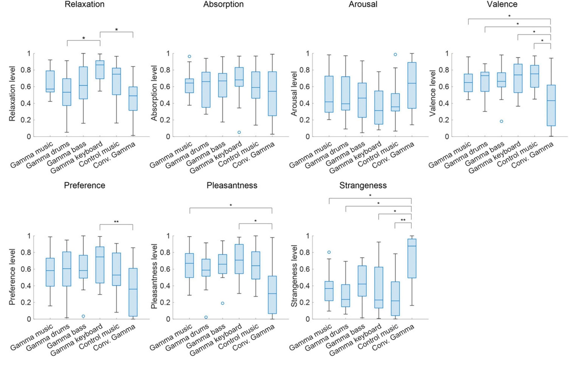 主観評価を図るアンケートの結果は、【Figure1】の通りです。リラクゼーション、感情価、好み、心地よさ、奇妙さの項目において有意な差が見られ、没頭、覚醒においては有意な差は見られませんでした。ガンマミュージックや通常音楽と比較して、従来法ガンマ音楽は不快感や好ましくないことを示す有意な差が明らかになった一方で、ガンマキーボードは最も好まれており、ガンマドラムや従来法ガンマ音楽と比較してリラックスにより強く関連し、快適で心地の良い自然な印象を参加者に与えたことが示されました。