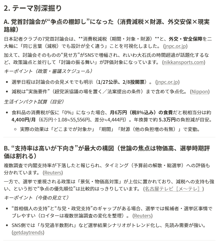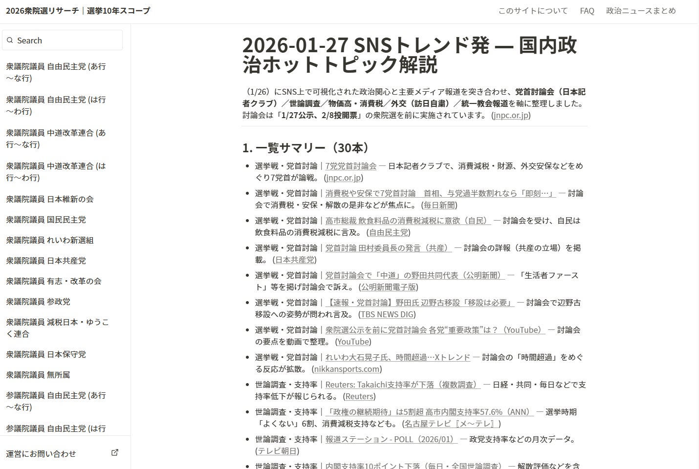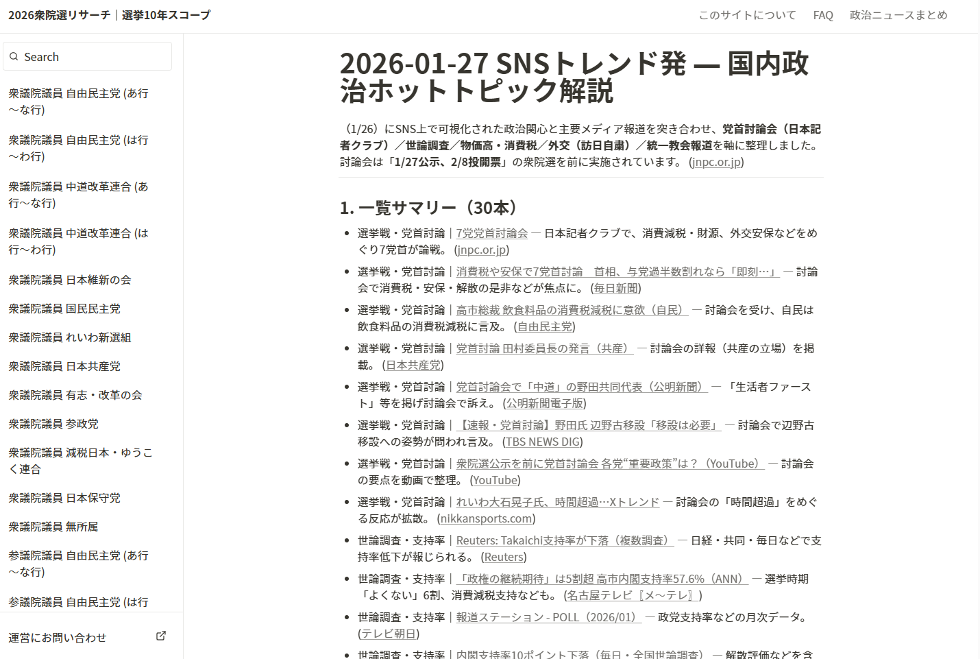 投票までの短い期間でも、候補者理解に必要な“論点”へ素早く辿り着けるよう、当サイトでは投票日(2/8)まで毎日、国内政治ニュースのまとめを掲載し続ける予定です。トップから「政治ニュースまとめ」へアクセスできます。