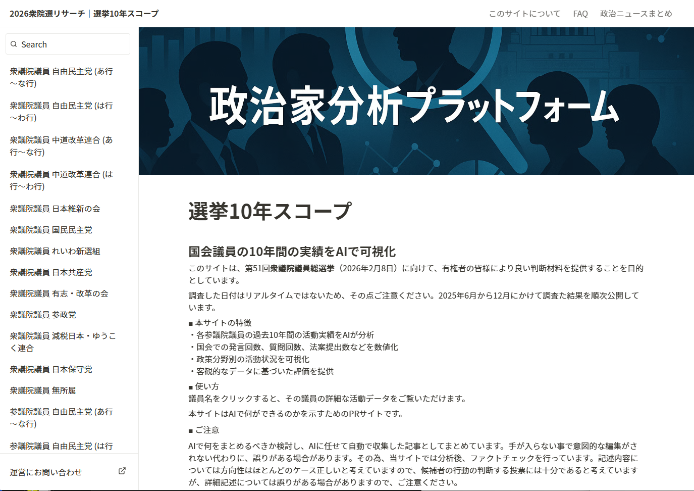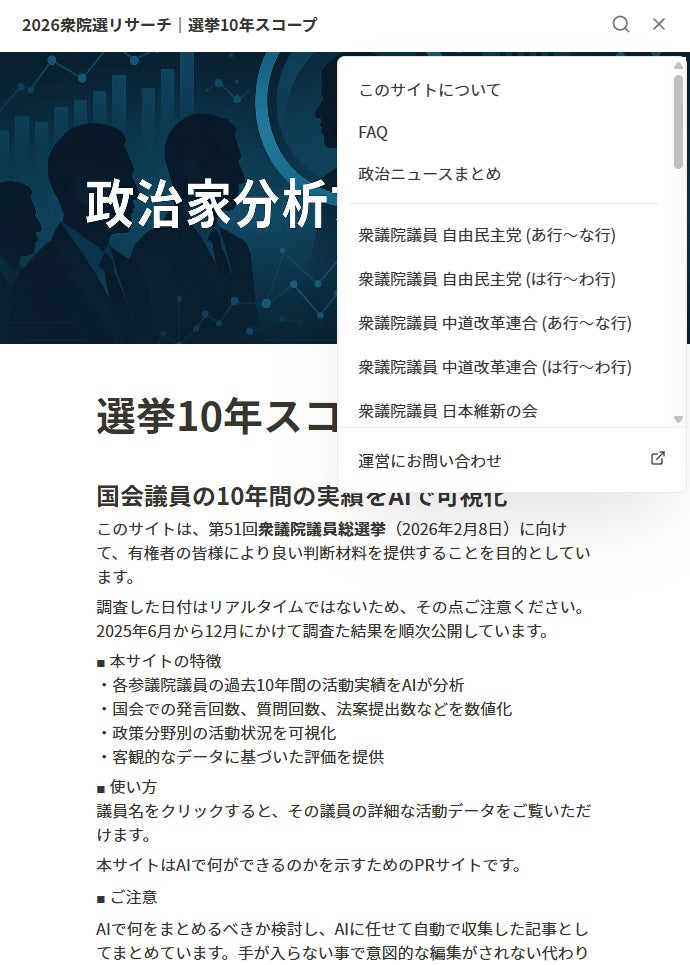 本サービスは、国会会議録や公開データ等の公開情報をAIで整理し、議員・候補者を「過去の実績」から比較・理解できる判断材料の提供を目指しています。直近10年間の議員の活動とマニュフェストを照らし合わせどんな活動を行ってきたのかをAIを利用して可視化するサイトです。※本衆院選でのマニュフェストではなく、前回の議員のマニュフェストとこれまでの活動を比較するサイトです。