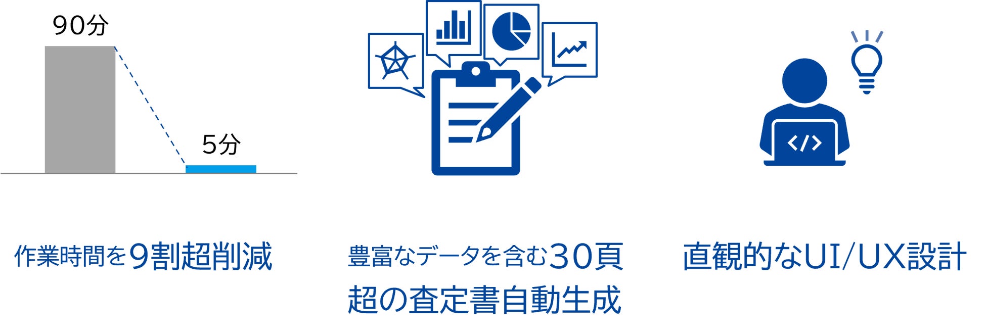 不動産の賃貸管理を行う企業では、適正な賃料を不動産オーナーに提案するために、多くの物件の賃料査定業務を行う必要があります。一般的に賃貸管理会社では査定業務以外に、リーシングと呼ばれる客付け業務や室内リフォーム、設備故障時のメンテナンス作業、退去精算等、多くの業務が存在しており、査定業務に割くことができる時間は限られています。そのような中で、賃料査定業務を行う際には、相場や事例、部屋や設備のグレード等を加味して査定を行い、査定賃料の根拠となる事例やデータを集めて資料を作成してオーナーに提示する必要があるため、分譲マンションで60~90分、一棟物件では120分程度かかることもあります。