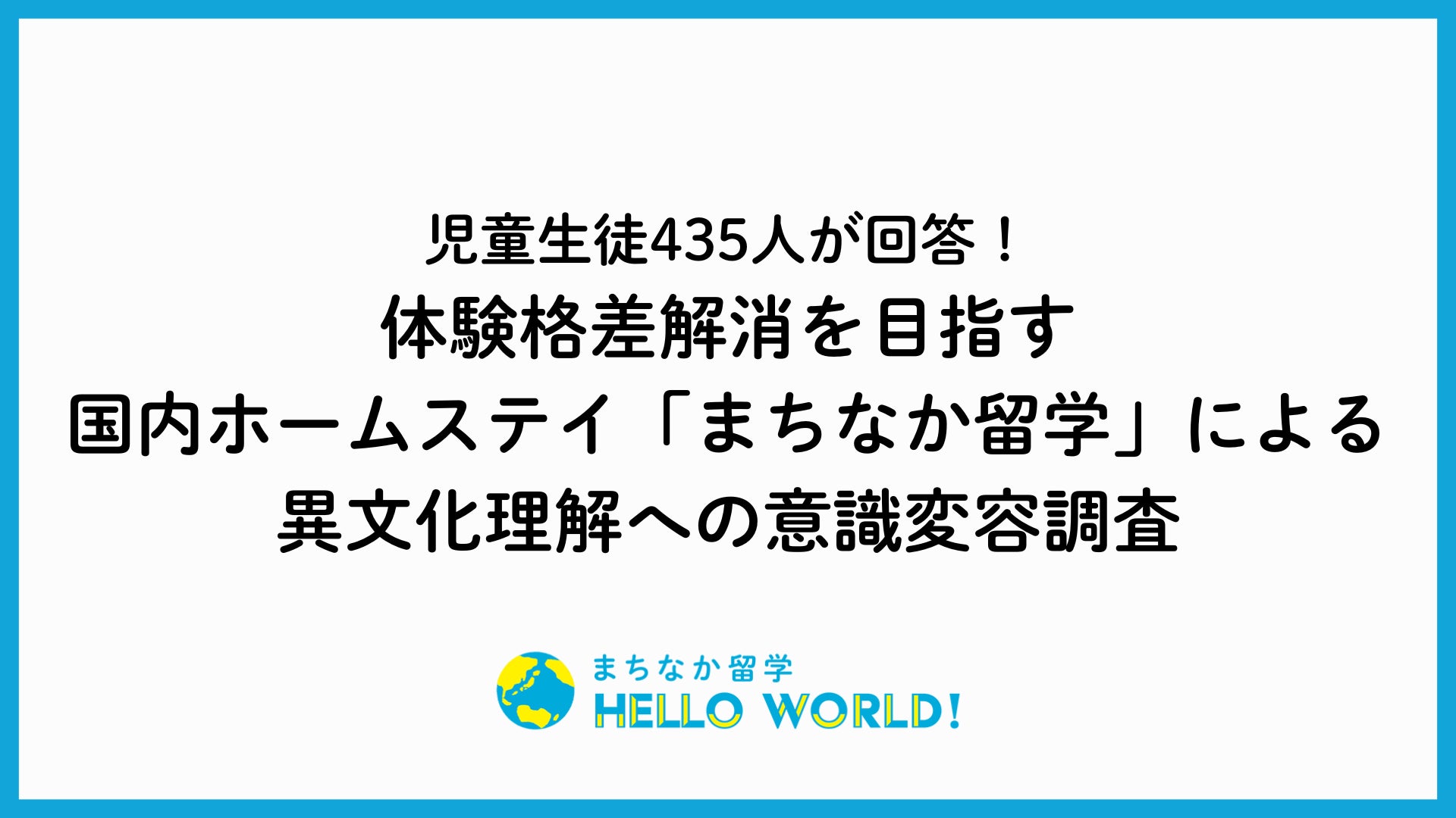 HelloWorld株式会社(本社:沖縄県沖縄市、Co-CEO野中光、冨田啓輔、以下「当社」)は、当社が提供する国内にいながらにして異文化交流体験を実現する「まちなか留学」への参加者に対し、プログラムを通して感じたことや参加前後の意識変容についての調査を実施しました。435名から回答を得ましたので、概要をご報告します。
