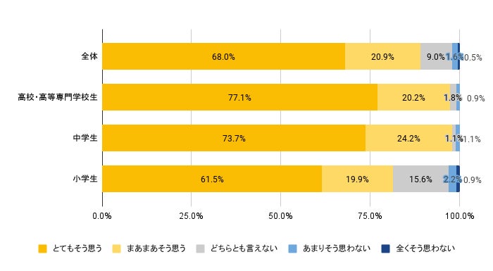 「学校で学習した英語を使ってコミュニケーションが取れると実感できましたか?」との設問に対し、全体の約89%が「そう思う(とてもそう思う:68.0%、まあまあそう思う:20.9%)」と回答しました。年代別で見ると、年代が高いほど「とてもそう思う」と回答した割合が高く(高校・高等専門学校生:77.1%、中学生:73.7%、小学生:61.5%)、学校の授業で学ぶ英語のレベルが上がるほど、まちなか留学で体験する実践的なコミュニケーションにおいても活かせると感じる方が多いことがうかがえます。