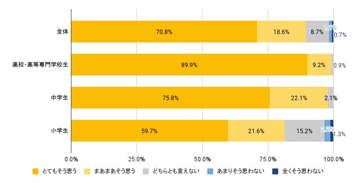 「まちなか留学」参加後に、以前よりも異文化に興味を持つようになったかを伺ったところ、全体の約89%が「そう思う(とてもそう思う:70.8%、まあまあそう思う:18.6%)と回答しました。年代別では特に高校・高等専門学校生の異文化への興味の高まりが強い結果でした。