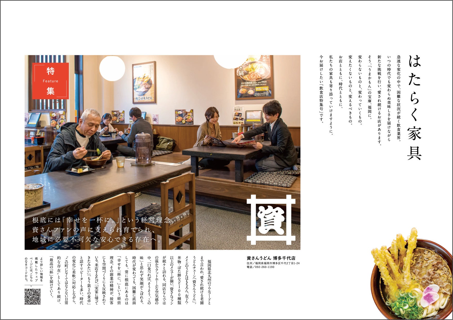 飲食・オフィス・ホテル等様々な業種に向け業務用家具を製造・販売する株式会社アダル(本社:福岡市博多区、代表取締役社⻑:武野 ⿓ 以下「アダル」)は、全国最新の納入事例をはじめ家具にまつわる最新情報を提供する広報誌「はたらく家具17号~変わらないもの、変わること。飲食店の現在地~」を4月22日(金)に発刊。急速な変化の中で、困難な状況が続く飲食業界。いつの時代も変わらぬ美味しさを届けながら新たな挑戦を行い、地元に愛され続けるお店を取材。EC事業が好調、北九州のソウルフードと名高いうどんチェーン「資さんうどん」佐藤社長、医療従事者無償招待キャンペーンが話題、もつ鍋ブームの火付け役とも言われる「元祖もつ鍋 楽天地」水谷社長にインタビュー。2022年2月にスタジアムでお披露目し、話題となったサッカーJ1リーグ所属のアビスパ福岡とのコラボ家具「アビソファ」の製作秘話も掲載。飲食オーナー様、店舗設計者などに向けお役立て頂けるリアルな情報をお届けします。