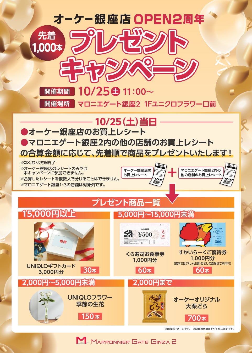 10月 25日(土)当日のオーケー銀座店のお買上レシートとマロニエゲート銀座 2 内の他の店舗のお買上レシートの合算 金額に応じて、先着1,000名様に商品をプレゼントいたします。