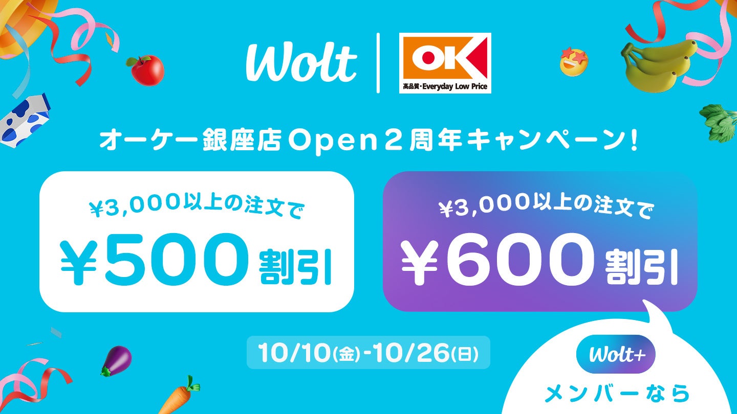 期間中、Woltでオーケー銀座店から3,000円以上のご注文で、商品代金の合計から500円を割引、Wolt+をご利用のお客様は600円を割引いたします。