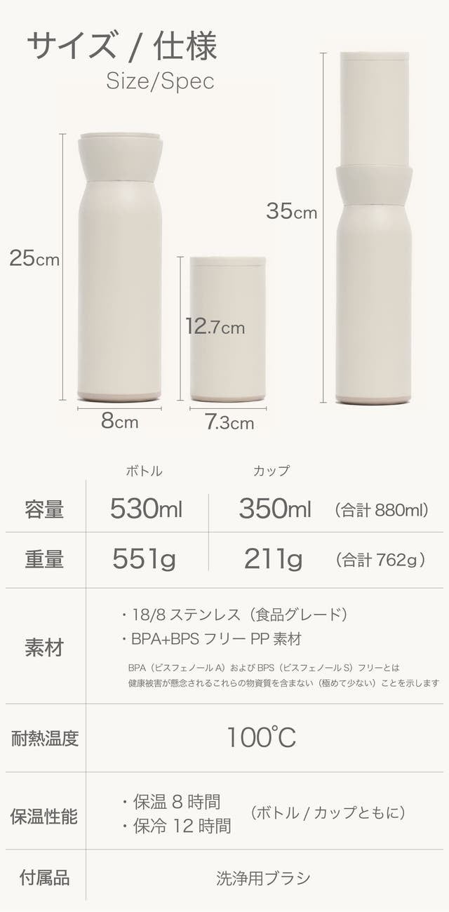 ボトル、カップともに真空二重構造を採用した魔法瓶だからこそ、