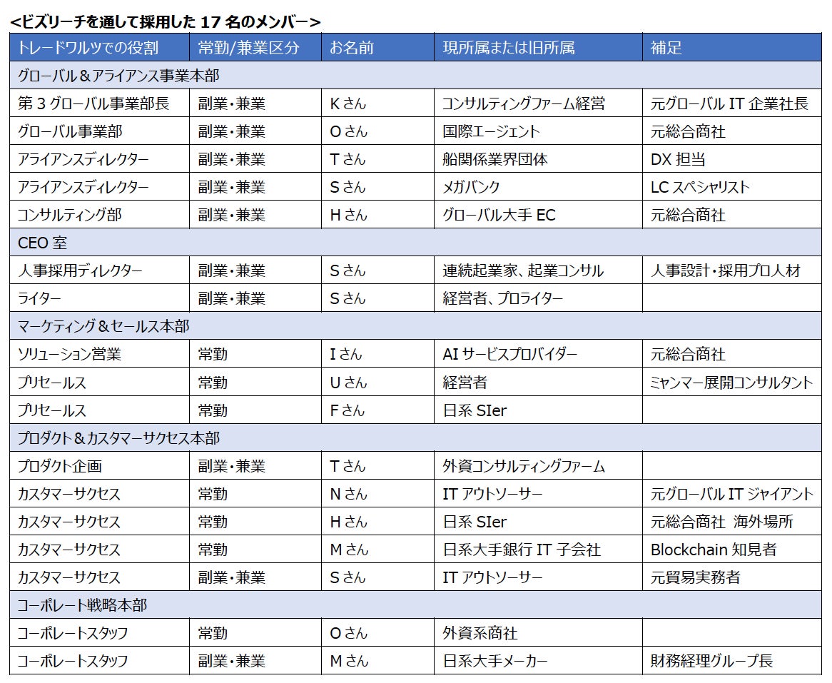その他、3月15日~4月11日にかけてビズリーチを通じて人材公募を行い、ご応募いただいた197名から17名のメンバーを採用した旨お知らせいたします。