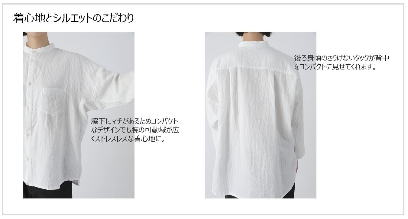 首回りをすっきり見せてくれるスタンドカラーのシャツ。肩の落ちたゆったりとしたシルエットで、ストレスなくリラックスして着ていただけます。