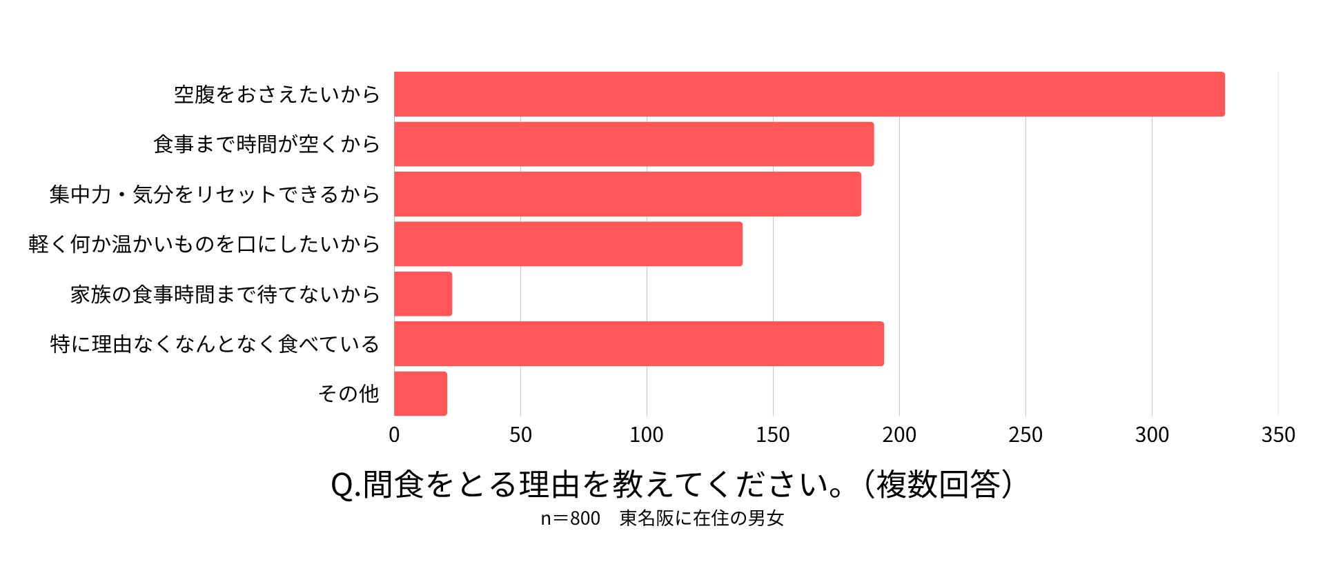 その理由として最も多かったのは、「つい口寂しくなったとき」(51.3%)で、次いで「食事までの時間が空きすぎるとき」(48.4%)となりました。