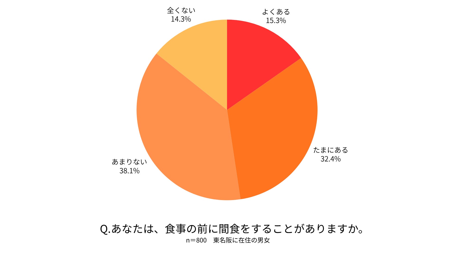 「食事前」の間食について問うと、回答者の47.7%が「食事前に間食をする」と回答。