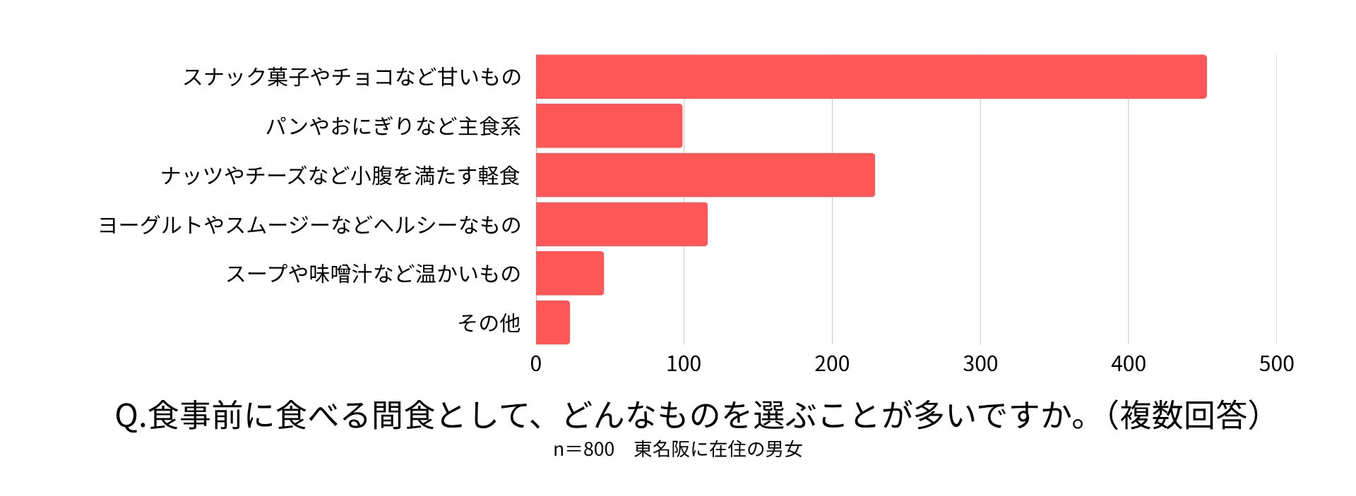 「食事前の間食」に選ばれるものでも、「スナック菓子やチョコなど甘いもの」(66.0%)がトップ。