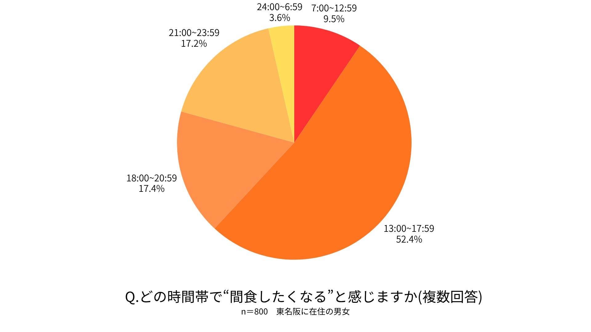 また、間食の時間帯は午後に集中しており、「13:00~17:59」が66.4%と圧倒的多数を占めました。ランチ後の休憩や夕食までの“間の時間”に、甘いものなどで一息つく人が多いようです。