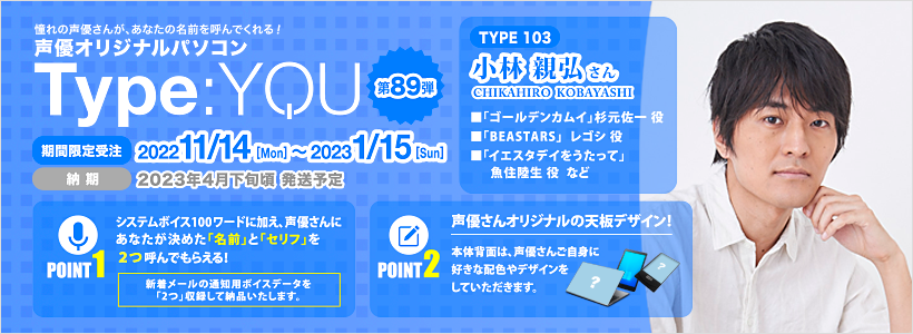 声優オリジナルパソコンに小林親弘さんが登場!【Type:YOU -タイプユー-】第89弾は11月14日よりスマッシュコアで受注開始!