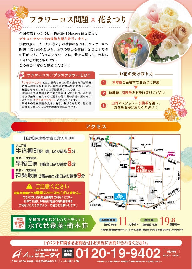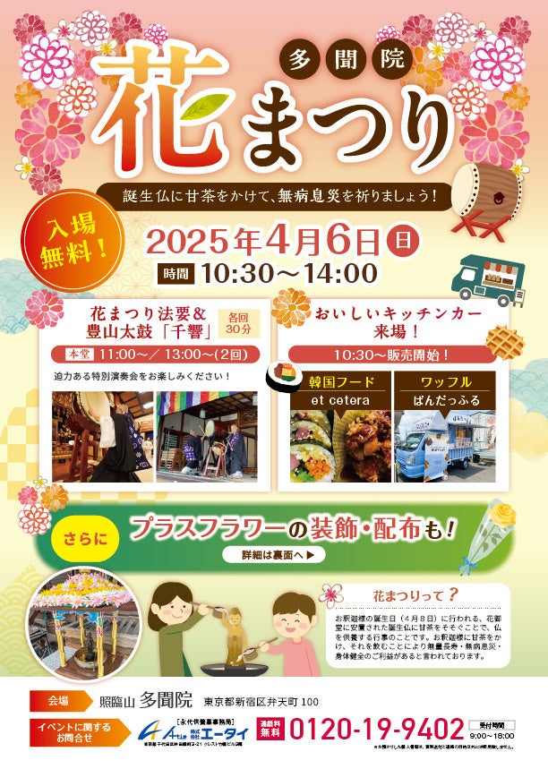 株式会社エータイ(本社:東京都千代田区、代表取締役:樺山玄基)は、2025年4月6日(日)に東京都新宿区の多聞院で開催される「花まつり」において、フラワーロス問題解決に貢献する取り組みを実施いたします。当日は、市場に出回らない規格外の花を活用し、花御堂(花で飾られたお堂)の装飾のほか、イベントに参加した先着100名に花の無料配布も行います。