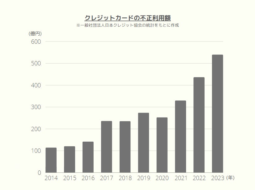 近年、オンラインでの商品やサービスの提供が増える一方で、クレジットカードの不正利用も1つの社会問題になっています。ここ数年で、クレジットカードの不正利用の手口が多様化し、日本におけるその被害額は2023年で540億と過去最高になっています。その被害は年々増加しており、10年で5倍ほどになるともいわれています。※1