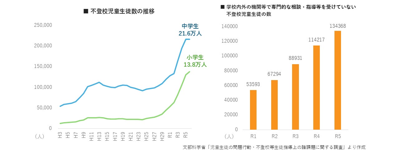 文部科学省の調査(※)によると、不登校児童生徒の数は現在35万人を超え、過去10年間で、小学生の不登校は5.3倍、中学生は1.4倍にと、増加の一途をたどっています。それに伴い、サポートを受けられていない子どもも増加しており、およそ「3人に1人」が専門的な相談・指導等を受けられておらず、従来の公的支援の枠組みだけでは対応が困難な状況にあります。