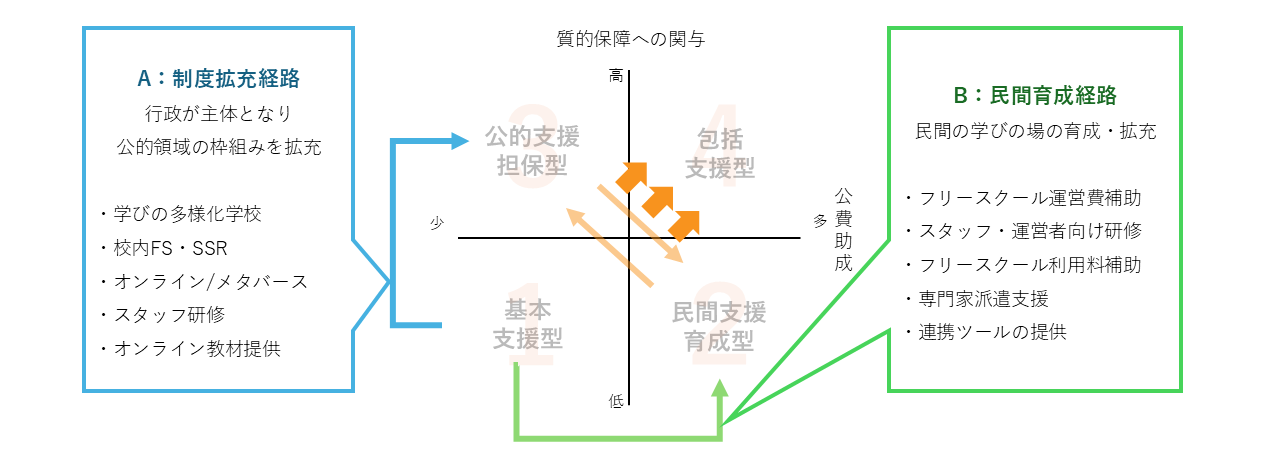 1つ目は、学校内の体制整備や学校外の公的な学びの場の整備を中心に進める「基本支援型」から、公的運営の学びの場の拡充とともに、民間(フリースクール等)の質向上をねらいとしたソフト面での支援を行う「公的担保支援型」に移行する【A:制度拡充経路】。