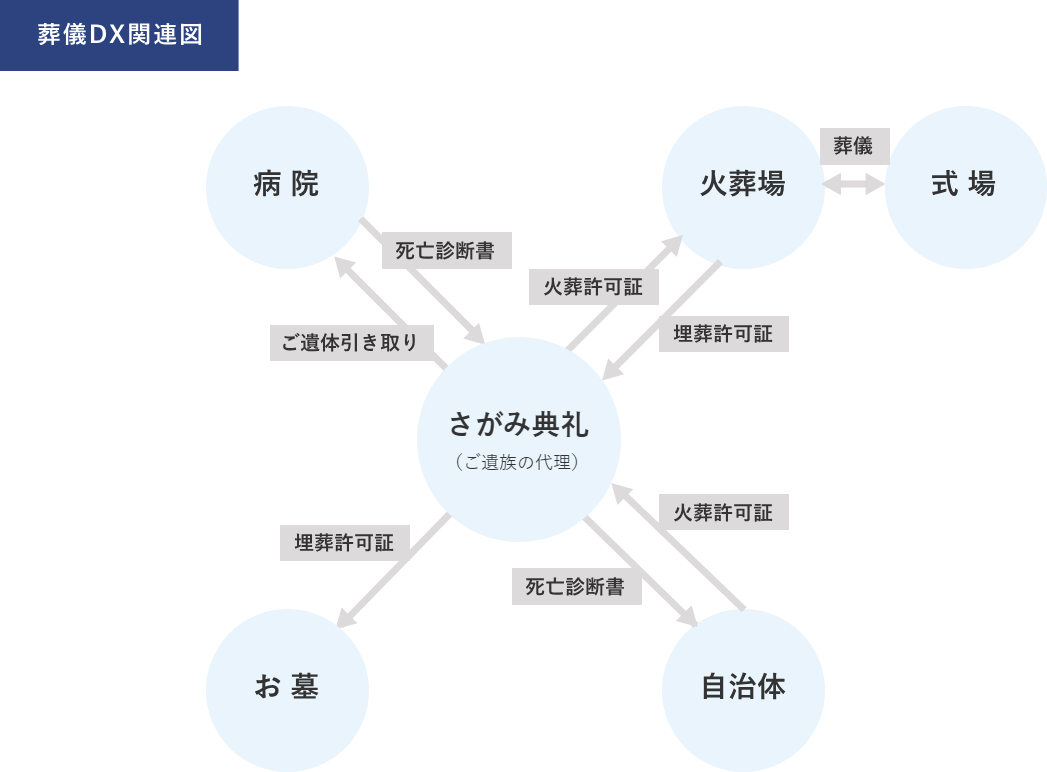 当社基幹システムであるZebraを基点に、病院・自治体・火葬場とのオンラインでのデータ連携の仕組みを構築し、顧客のニーズが発生次第、速やかな書類電子発行・提出を行います。さらに、蓄積したデータを基に需要予測を行い関係各所に伝達することで、関連業務にかけるリソースの配分最適化を目指します。