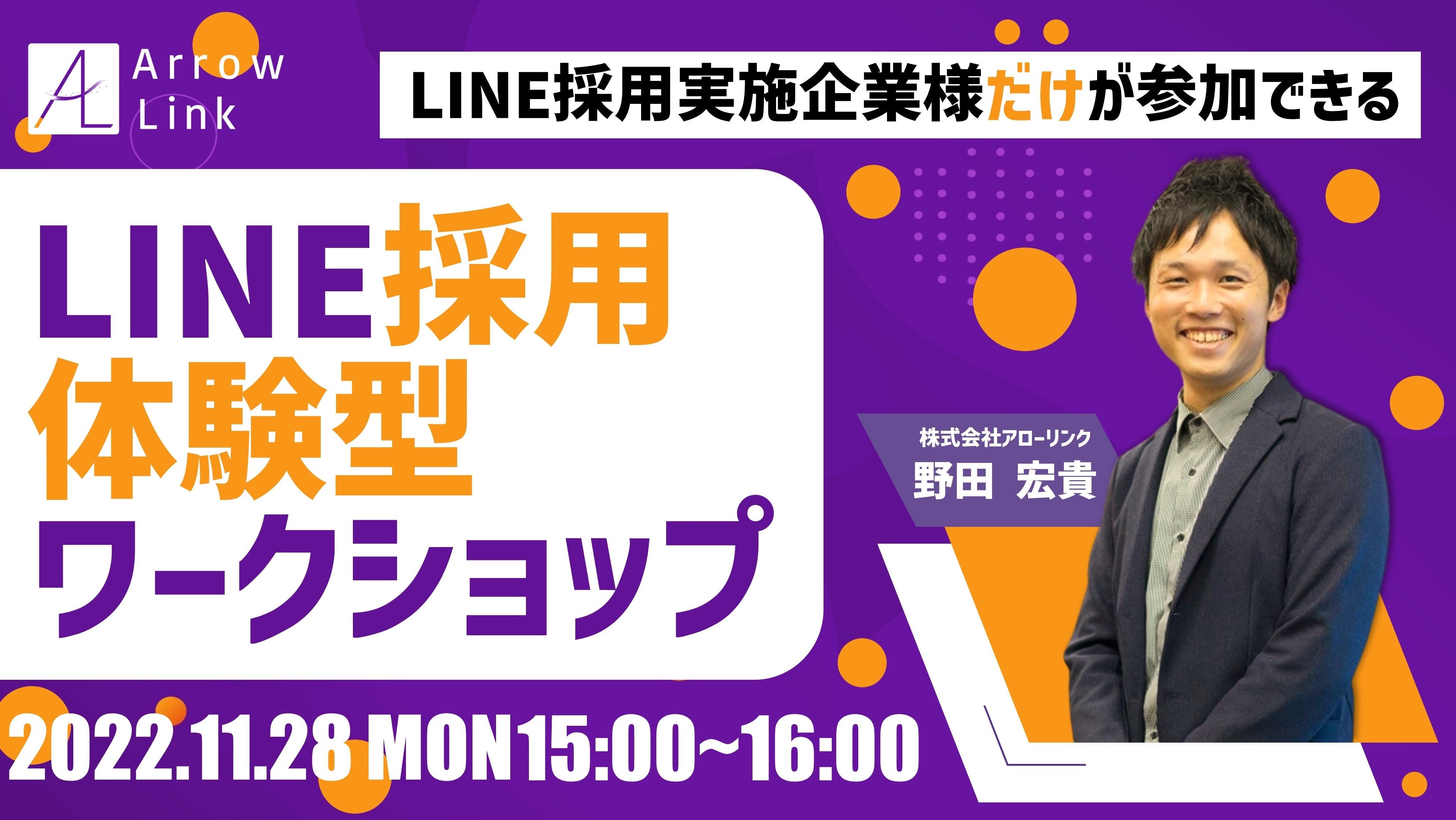 株式会社アローリンク(本社:兵庫県神戸市、代表取締役:蓬莱和真)は、11/28(月)にLINE採用実施企業様向けのオンラインセミナーを無料で開催します。「<LINE採用実施企業様限定>LINE採用体験型ワークショップ」と題し、LINE採用を体験して頂ける内容となっております。