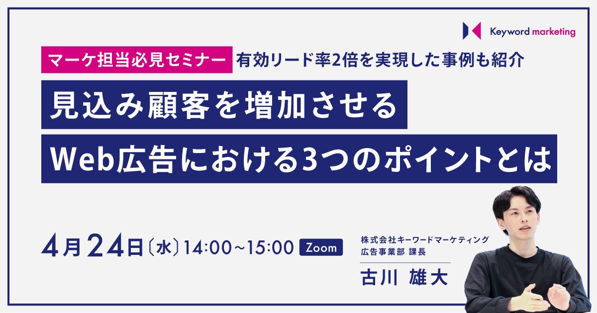 株式会社ベクトル(本社:東京都港区、代表取締役会長兼社長:西江 肇司、東証プライム:6058)の子会社である株式会社キーワードマーケティング(本社:東京都中央区、代表取締役会長:滝井 秀典)は、無料オンラインセミナー『マーケ担当必見セミナー 有効リード率2倍を実現した事例も紹介 見込み顧客を増加させるWeb広告における3つのポイントとは』を4月24日(水)14時より開催します。