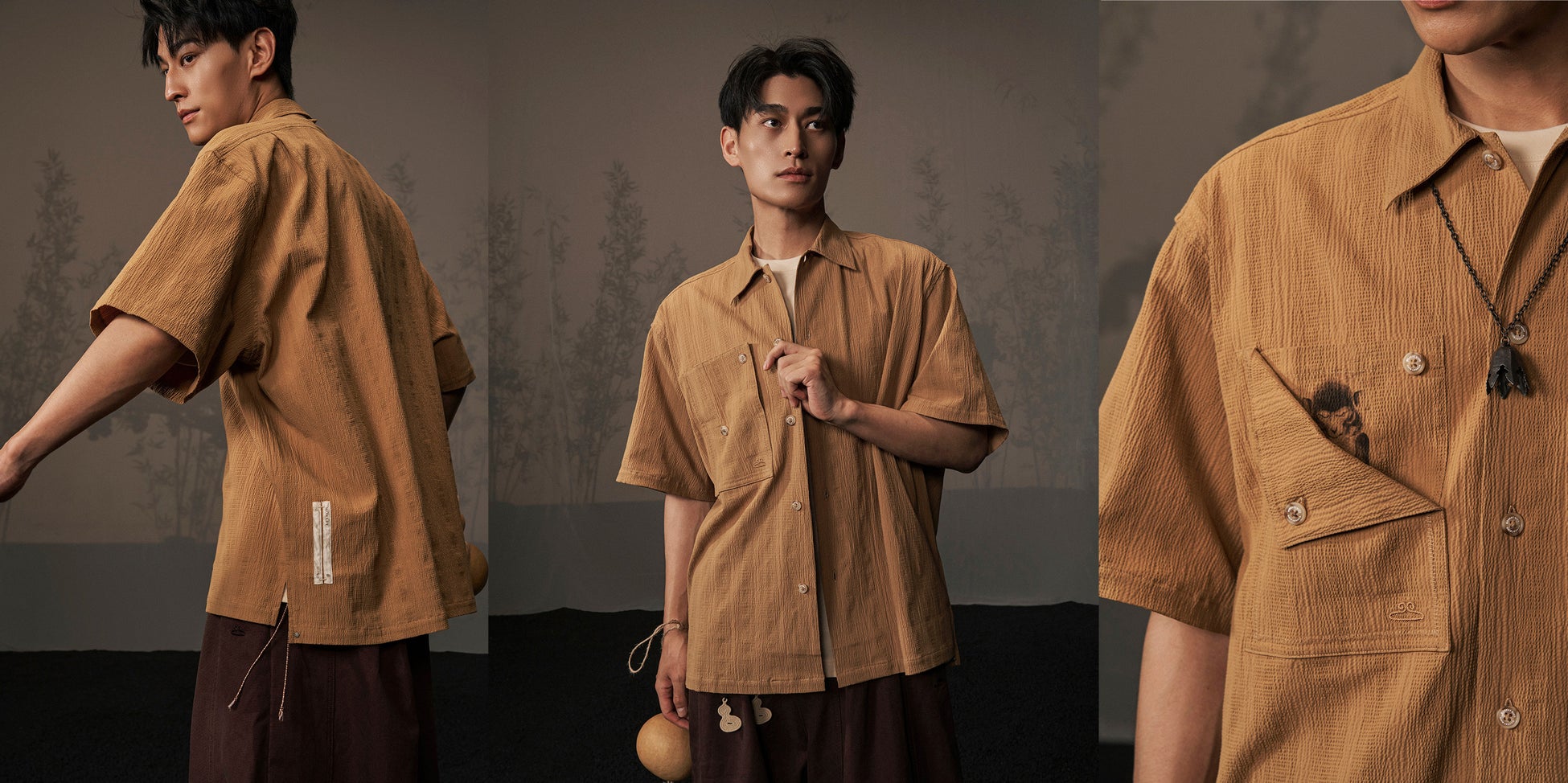 須菩提祖師の弟子の服装からインスピレーションを得たシャツ。「貌(かたち)は身と自ら別にして、心と相ともに空し」という西遊記劇中のセリフの様に、素朴であり、ありのままのスタイルを強調した仕上がり。表面の生地には花びらのデザインがランダムに配置されており、どの一枚も唯一無二の仕上がりとなっています。素材: 綿65%、ポリエステル35%