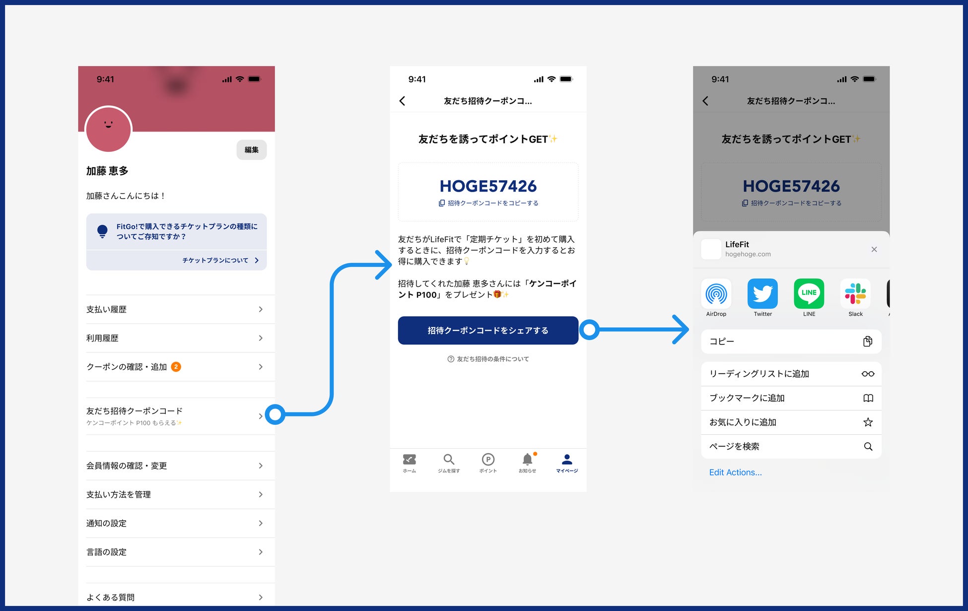 LifeFit(ライフフィット)の既存ユーザーは新規ユーザーを招待することによって、ケンコーポイントを100ポイント取得できる新機能です。