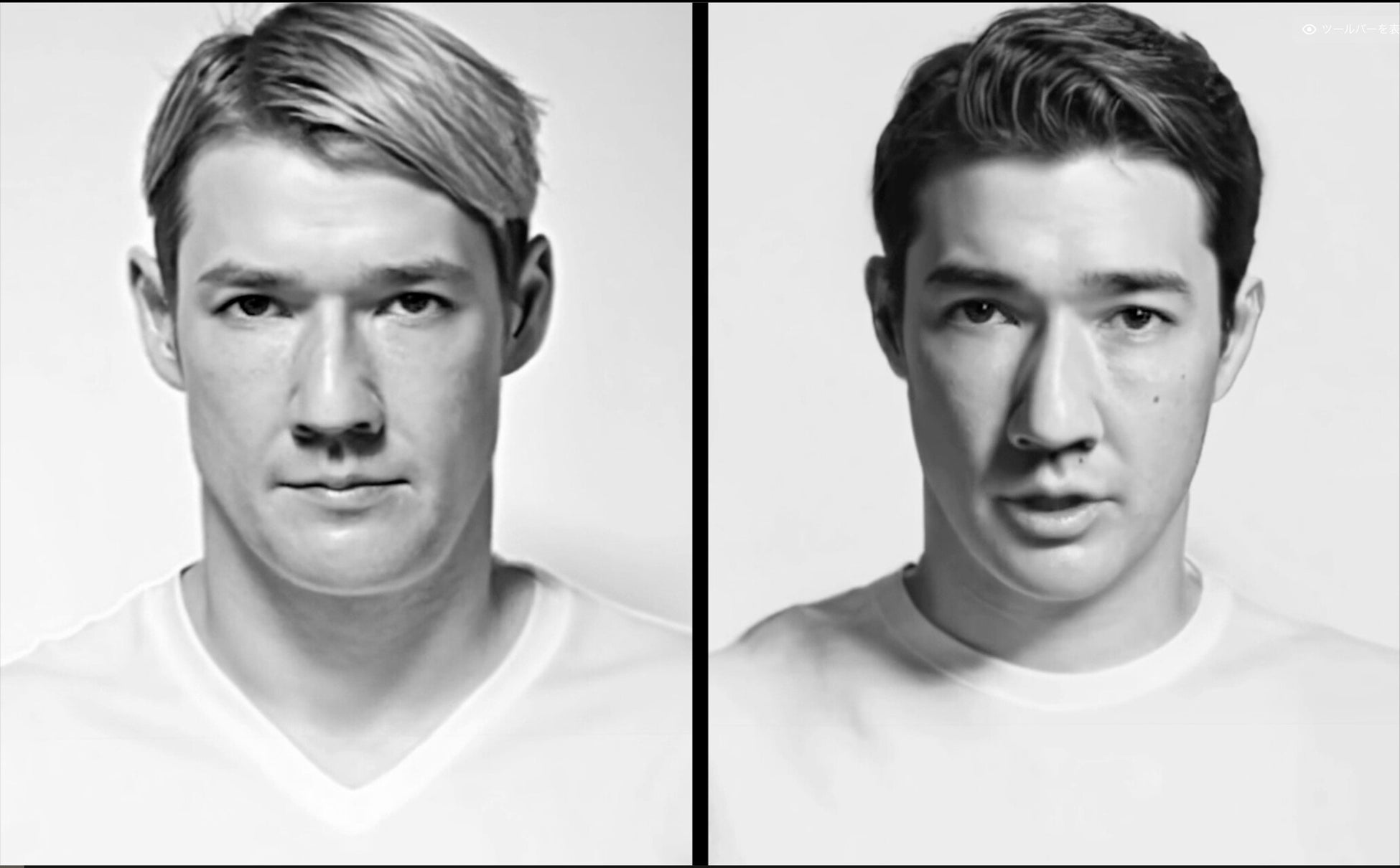 ふたつのモニターに、さまざまな人類の課題について議論をしつづける2人の男性が映し出されます。この2人は、アーティストであるスプツニ子!の容姿や声音を生成AIモデルによって「白人男性」化し、さらにイーロン・マスクやピーター・ティールなどのいわゆる「Tech Bro」的思考を憑依させたアバター(コミュニケーションを行う分身・キャラクター)です。2人の議論の内容も、全てAIによって生成されています。