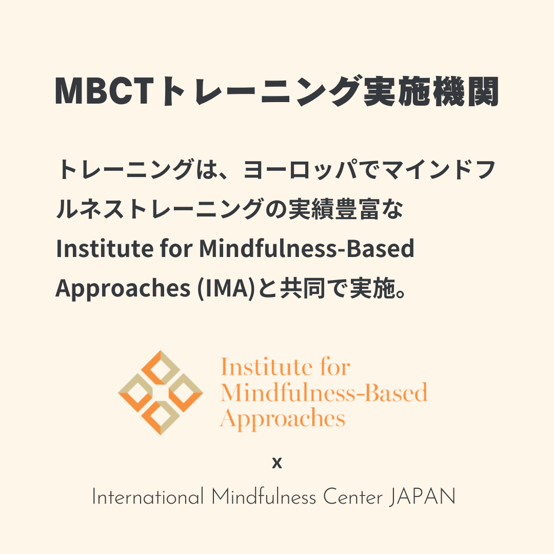 インターナショナルマインドフルネスセンタージャパン(International Mindfulness Center JAPAN: IMCJ 代表:井上清子)は、日本におけるマインドフルネス普及のために設立され、マインドフルネスに関連する学術関係者、医療関係者、マインドフルネス講師等による相互交流を目的として活動しています。その活動の一環として、ヨーロッパで古くからマインドフルネスを研究をしているIMAと提携し、MBSR(マインドフルネスストレス低減法)、MBCT(マインドフルネス認知療法)、MBCL(マインドフルネスに基づくコンパッションのトレーニング)始めとした8週間コース、MBSRの講師養成講座を開講しています(2022年10月時点で1期が終了、2、3期が開講中)。また、マインドフルネスおよびコンパッションの指導に関わる方が、世界中で活躍する様々な専門家、臨床家、研究者からマインドフルネスについて学び、自身の実践を深めるための、オンラインスタディグループ、マインドフルネスを日常生活に落とし込む習慣化コースも開講しています。