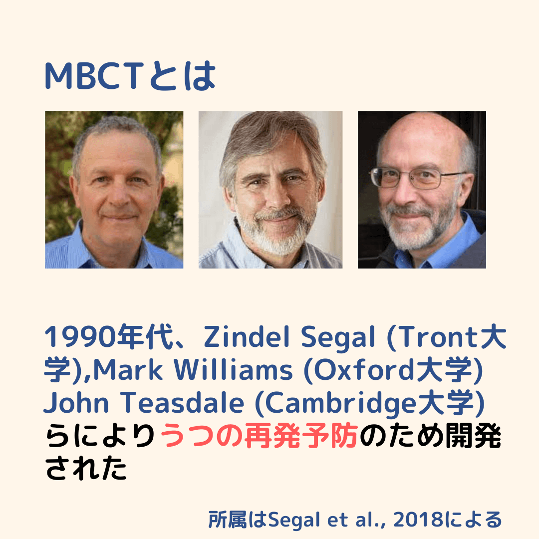 MBCTは、うつの再発予防のためのプログラムとして、マインドフルネスストレス低減法(MBSR)と認知療法を組み合わせて開発されたもので、海外の研究では抗うつ薬同等の効果があるとされており、イギリスの国家機関では、うつの再発予防で優先的に用いるべき手法として示されていたり、毎年数十名の講師を育成するための予算が計上されているようなプログラムです。