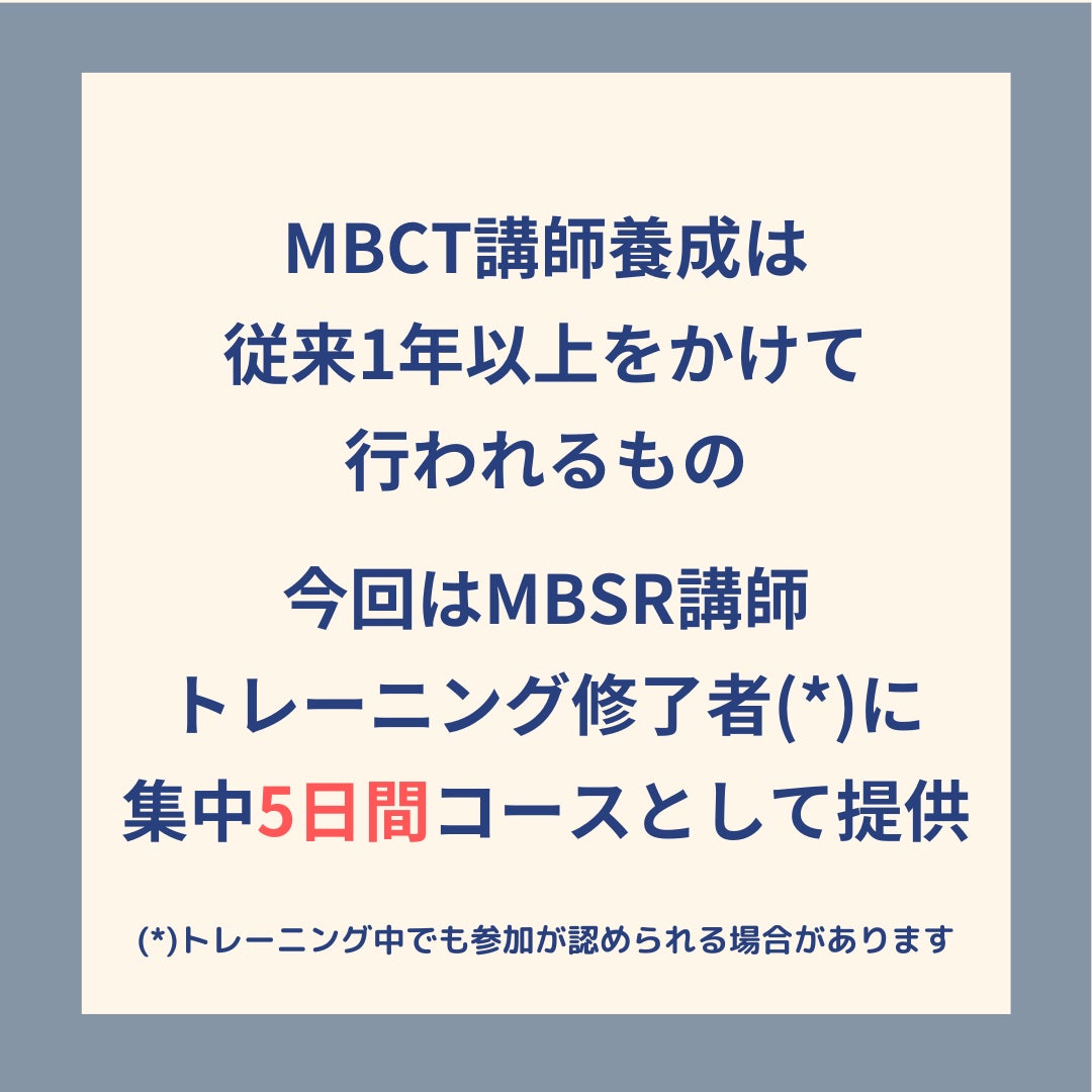 今回、MBSRトレーニングを受講終了されている方に向け、5日間の集中フォーマットでMBCT講師養成トレーニングを実施いたします。