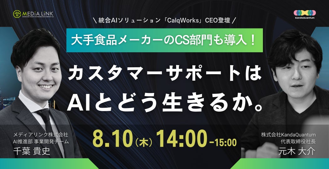 【8月10日(木)14時~】大手食品メーカーのCS部門も導入!統合AIソリューション「CalqWorks」CEO登壇!カスタマーサポートは、AIとどう生きるか。※ウェビナー開催のお知らせ
