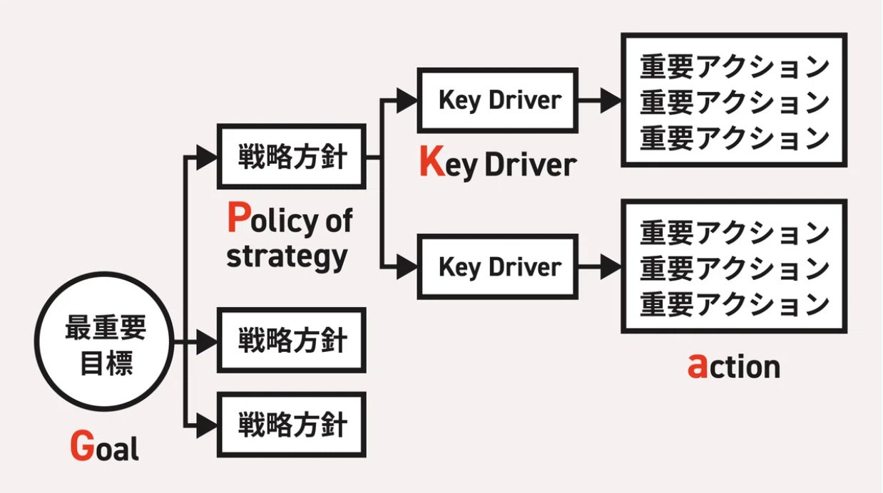 目標と戦略方針に対して、そして「どのような指標を追えばその戦略方針の実行がドライブされるのか?」という指標を、EVeMでは”Key Driver”と呼びます。そして、そのKey Driverを達成するためのアクションを”重要アクション”と定め、目標・戦略方針・Key Driver・重要アクションの頭文字を取り"GPKa(ジーピーケイエー)"と名付けフレームワーク化しました。
