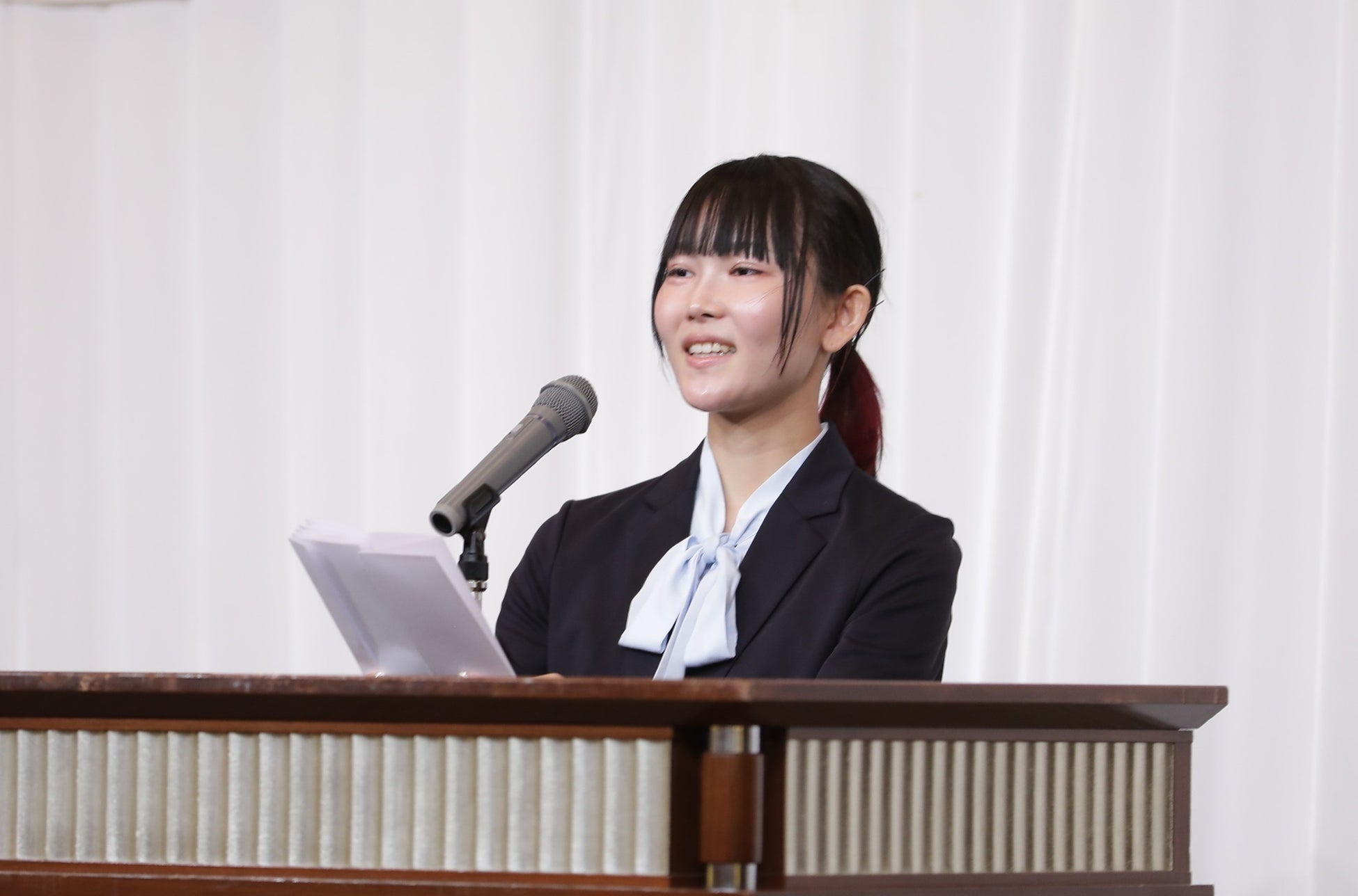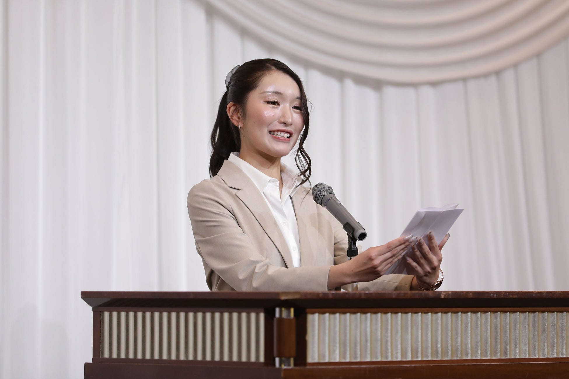 社会人としての第一歩を踏み出す新入社員を前に、星野万里 社長より「本日はご入社おめでとうございます。当社は、今年1月1日より企業ロゴデザインをはじめとするリブランディングを実施し、昨年には組織改革の一環として社名を NEXUS株式会社 から D’station株式会社 へ変更しました。現在は、NEXUSホールディングス株式会社のもと、新たな体制で事業を展開しています。そのような節目の中で、皆さんを新入社員として迎えることができ、当社でどのように活躍していくのかを非常に楽しみにしています。業務においては、研修制度をはじめ、先輩社員や上司がしっかりとサポートしていきますので、安心して仕事に取り組んでください。また、若さは無限の可能性を秘めた力です。当社は、意欲ある皆さんが力を発揮できる機会と環境を整えていますので、ぜひ自らを磨き、チャンスを活かして成長へとつなげてほしいと思います。