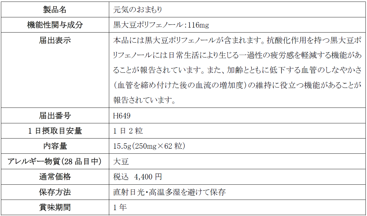 フジッコ株式会社は「疲労」と「血管」に着目し、黒豆ポリフェノールの抗酸化作用により、「日常生活により生じる一過性の疲労感を軽減する」「加齢とともに低下する血管のしなやかさ※の維持に役立つ」の二つの機能をもつ「元気のおまもり」を開発し、今回発売するに至りました。