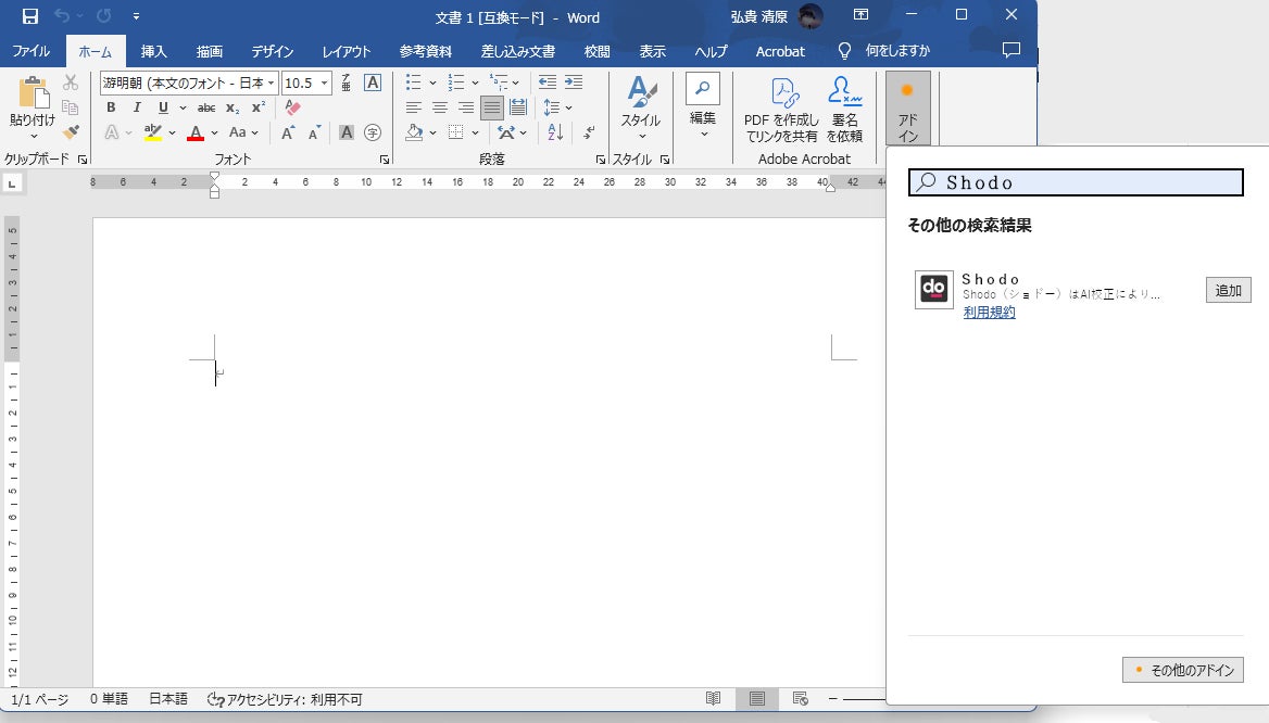 ShodoのアドインをWordにインストールするには、Wordのリボンメニューの「ホーム」から「アドイン」を選択します。アドインの検索欄から「Shodo」と入力し表示されたShodoのアドインを「追加」すれば導入が完了します。