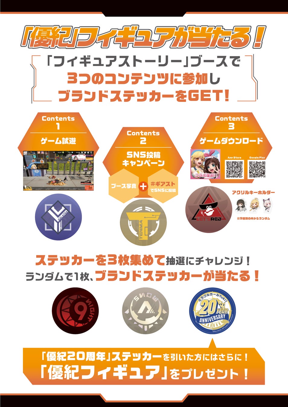 ブース内で「ゲーム試遊」「SNS投稿」「ゲームダウンロード(もしくはアプリアイコンの提示)」を行うと、ギアストフィギュアブランドロゴステッカーやアクリルキーホルダーをもれなくプレゼントいたします。(ただし数に限りがございます。また、アクリルキーホルダーの種類はお選びいただけません。)さらに上記全てのアクションを行った方は、“優紀”フィギュアが当たる抽選会に参加できます。抽選BOXの中から“優紀20周年ステッカー”を引いた方先着10名様に、“優紀”フィギュアをその場でプレゼント!