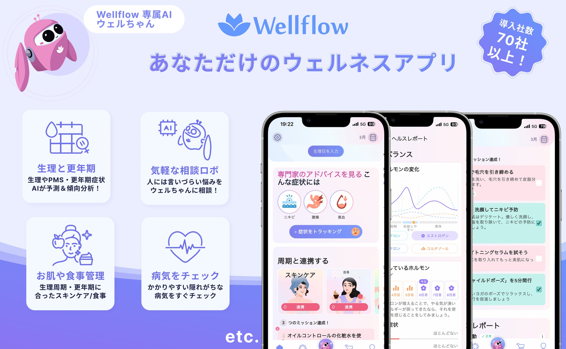 『Wellflow』アプリでは、AIとの相談チャットや専門医とのオンライン診療により、性別特有の健康課題に関する多様なお悩みに対応します。