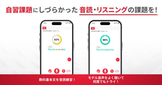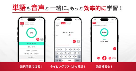 教科書の本文を活用した音読・リスニングの学習をシンプルに実現できます。生徒さんの発音した音声とスコアも含めて管理画面にリアルタイムに集約されるので、生徒さんの学習状況を「見える化」することができます。また、新課程で大幅に増加した英単語の学習も、フラッシュカードでの仕分け、四択問題、間違えた問題の復習や、忘却曲線に沿った復習などを活用し、アプリで効率的に学習することができます。