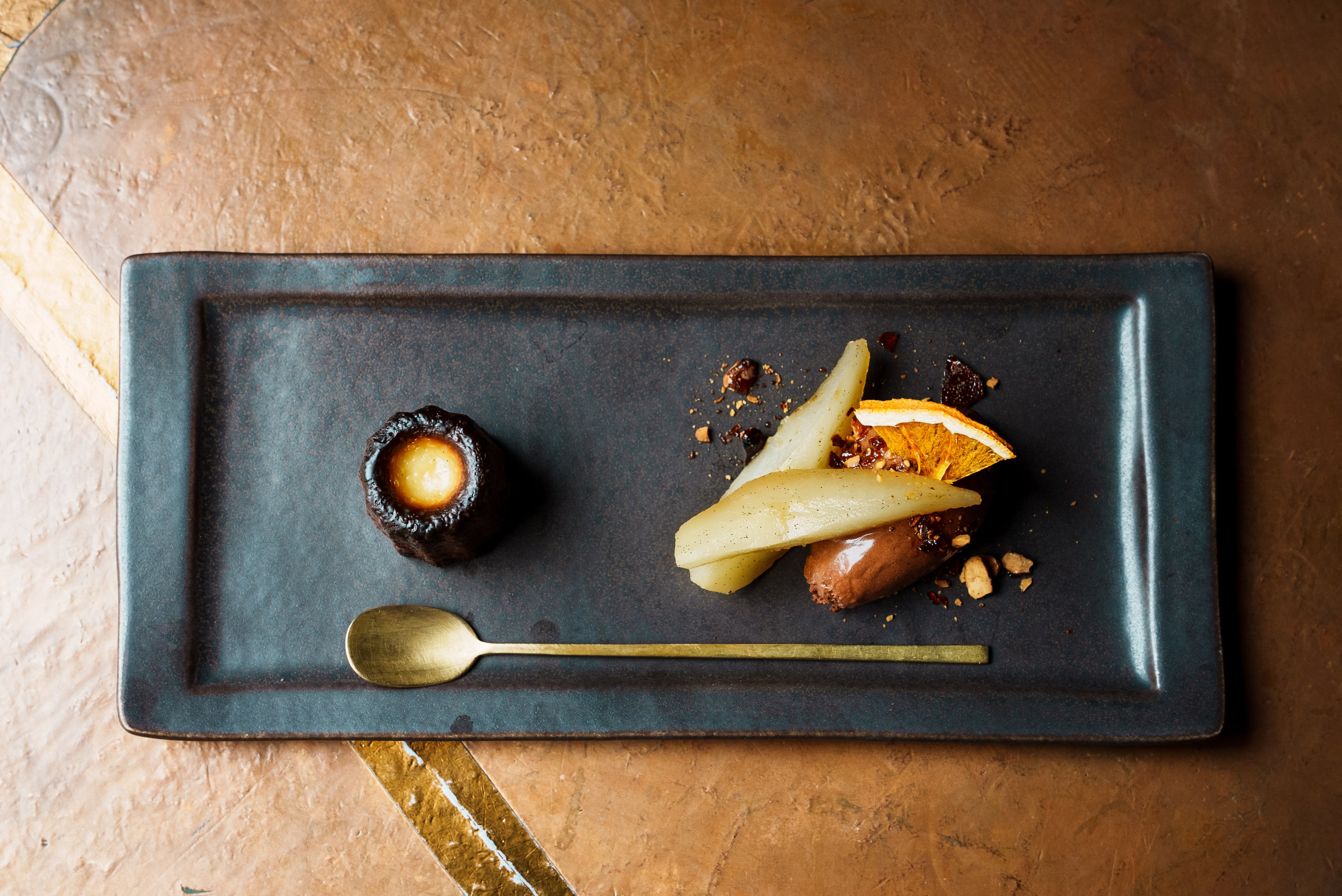今回新登場するプレート『ROE & CO ウイスキーカヌレプレート』は、POP UPにて1日最大1000個以上売れるシンプルながら上質な味わいで大人気の「GINZA Corridor Cannelé」を特別にアレンジ。日本初上陸のウィスキー『ROE & CO』と3種類のオレンジを使用したオレンジリキュールをブレンドし「GINZA Corridor Cannelé」に注入して仕上げたウイスキーカヌレと、洋梨のコンポートとオレンジ風味のショコラムースをペアリングとして添えた、期間限定のカヌレプレートです。
