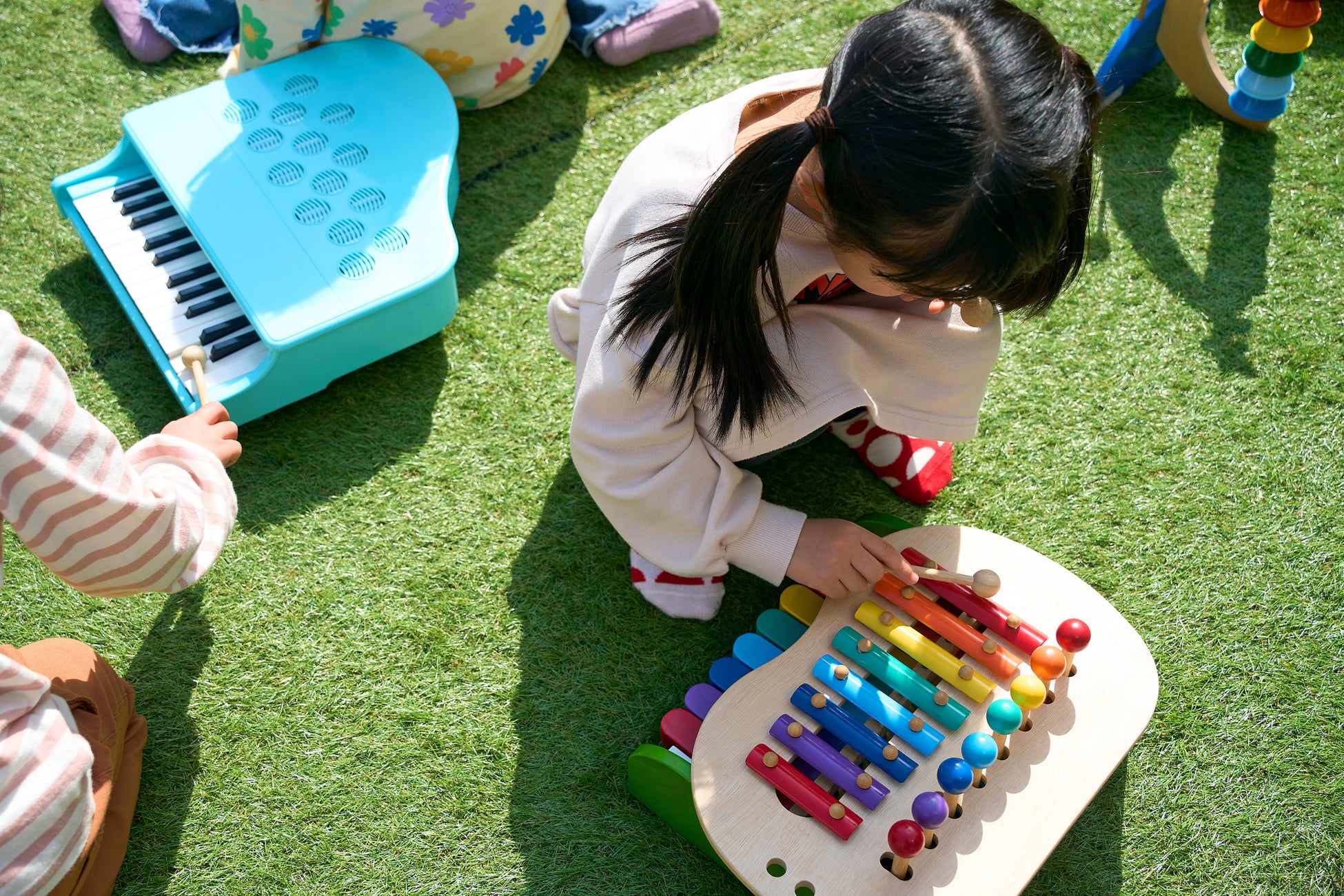 0歳のお子さまから参加可能です。小さな手でも簡単に音が出せる楽器に触れてのびのびと音あそびができます。