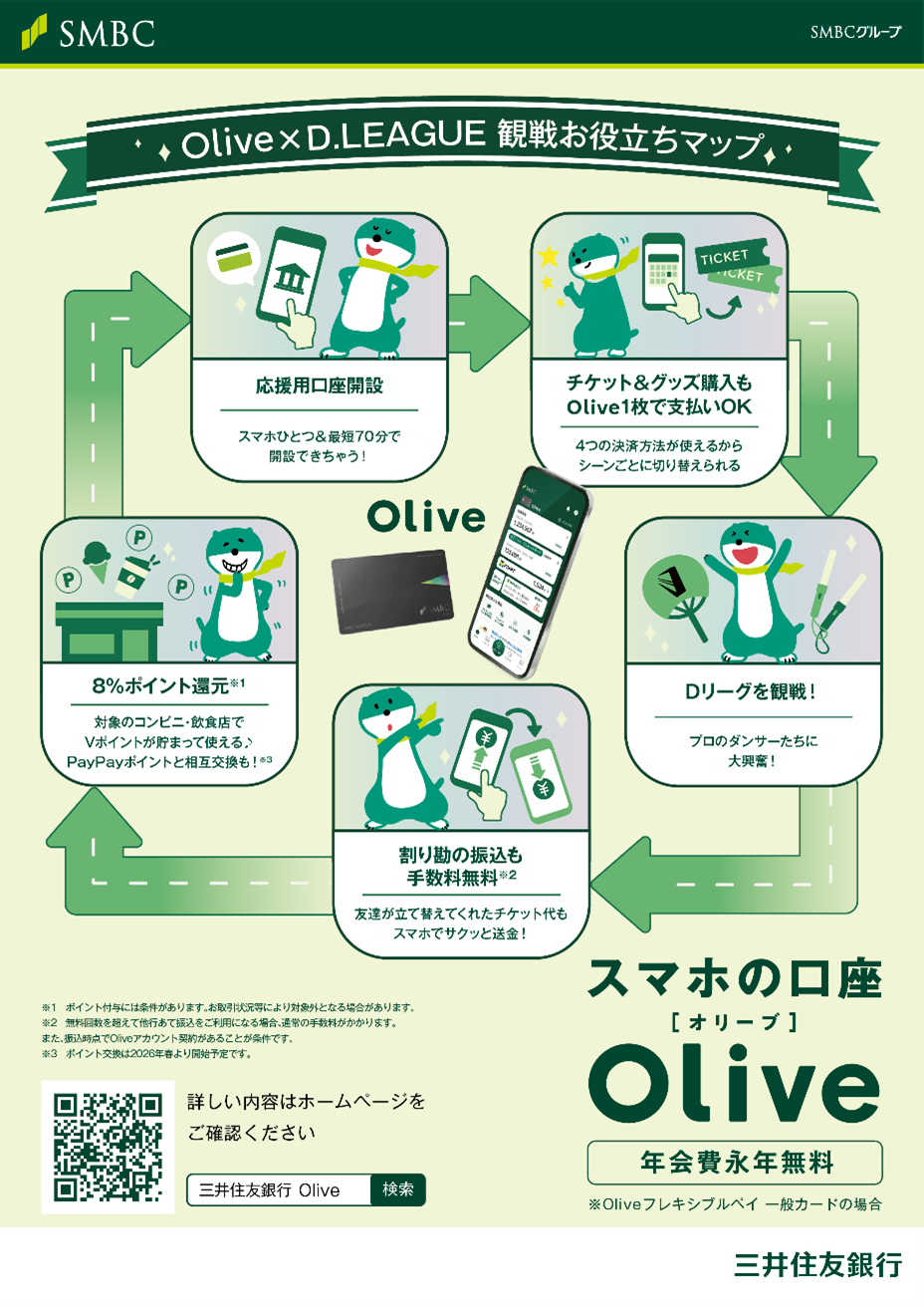 日本発のプロダンスリーグとして注目を集めるD.LEAGUEは、圧巻のパフォーマンス、チームごとの世界観、そして会場ならではの熱量で、若い世代を中心に高い支持を集めています。またOliveもサービス開始以降、新規で開設されたお客さまの約半数が20代以下の方となり、アルバイト等の給与振込先口座としての活用や決済、口座、証券、ポイントを1つのアプリで管理できる利便性を魅力に感じていただいております。