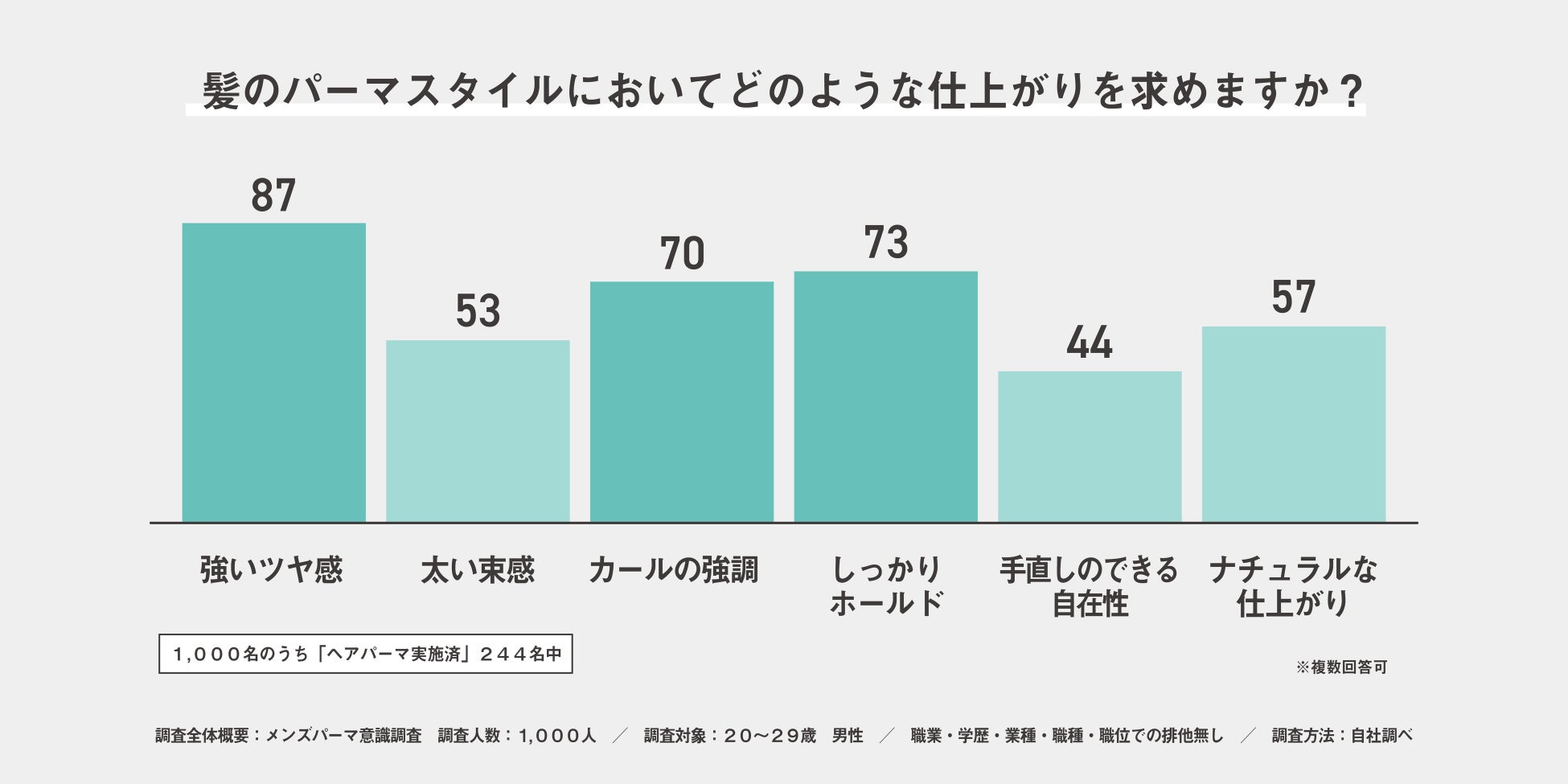 パーマ実施済層が理想のパーマスタイルに求める要素として、「強いツヤ感」「カールの強調」「しっかりホールド」の3つが比較的高く、ウェットな質感や立体的なボリュームがあるスタイルの人気の高さがうかがえます。