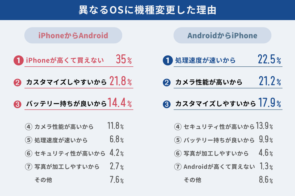 一方、AndroidからiPhoneに機種変更した理由は「処理速度が速いから(22.5%)」「カメラ性能が高いから(21.2%)」「カスタマイズしやすいから(17.9%)」と、機能面の理由がそれぞれ20%前後で割れる結果になりました。
