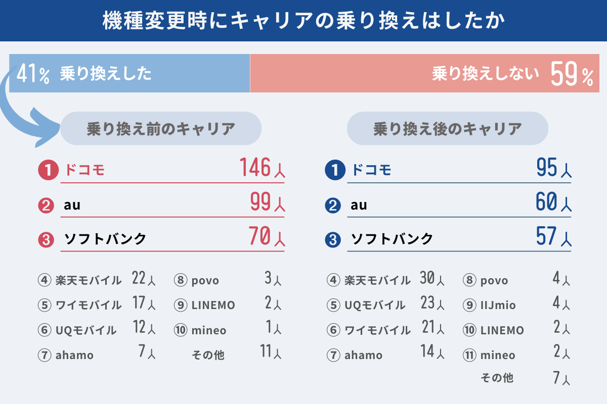 乗り換えをした41%の内訳をみると、大手キャリア(ドコモ、au、ソフトバンク)ユーザーが減少する一方で、楽天モバイルやUQモバイル、ワイモバイル、ahamoなど、比較的通信環境の良いリーズナブルなキャリアの増加が目立ちました。